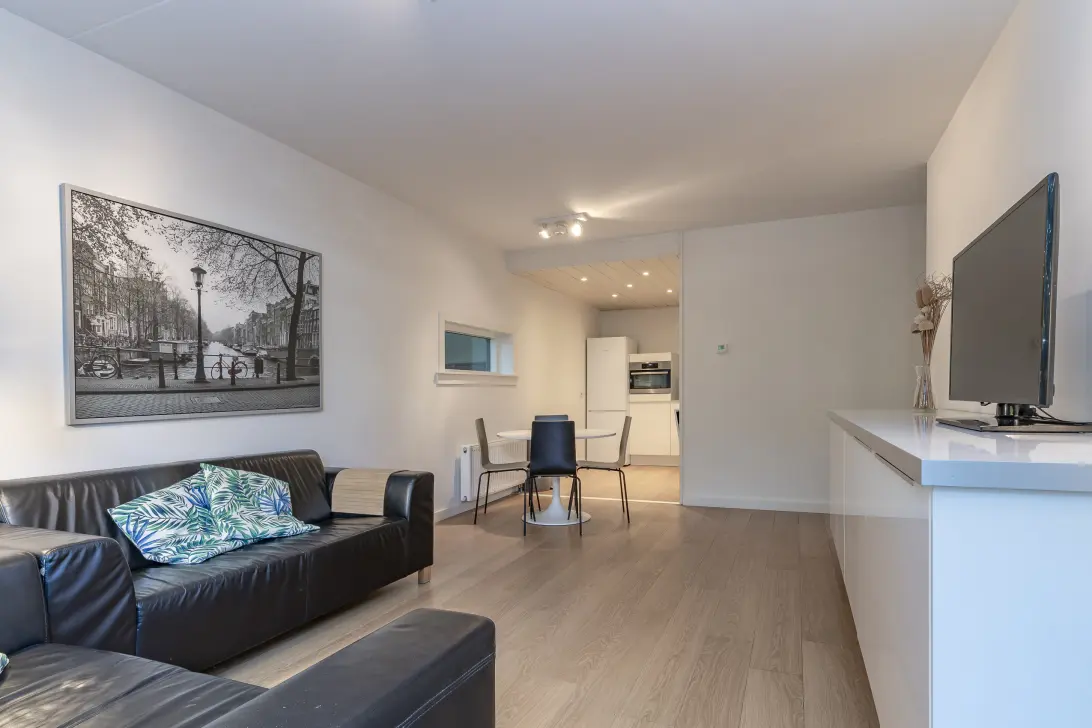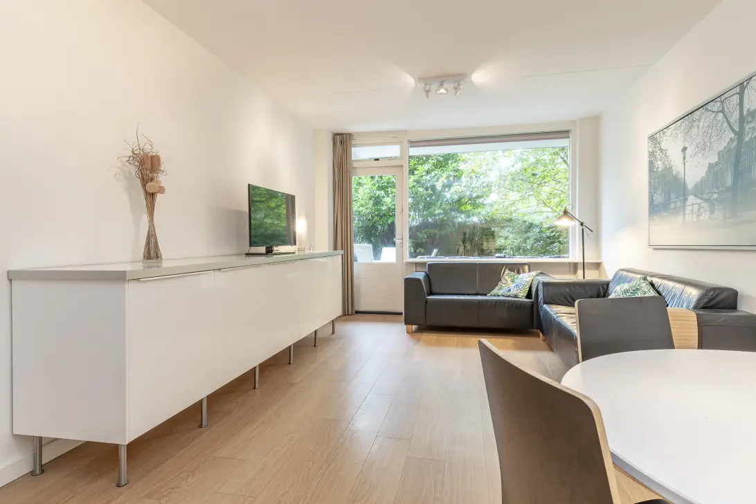 De lichte woonkamer is ruim opgezet en vormt samen met de open keuken (2023) een fijne leefruimte. De keuken is modern uitgevoerd en voorzien van kwalitatieve apparatuur van AEG: inductiekookplaat, combi-oven, vaatwasser en koel-/vriescombinatie. Vanuit de woonkamer stap je zo de zonnige tuin in.