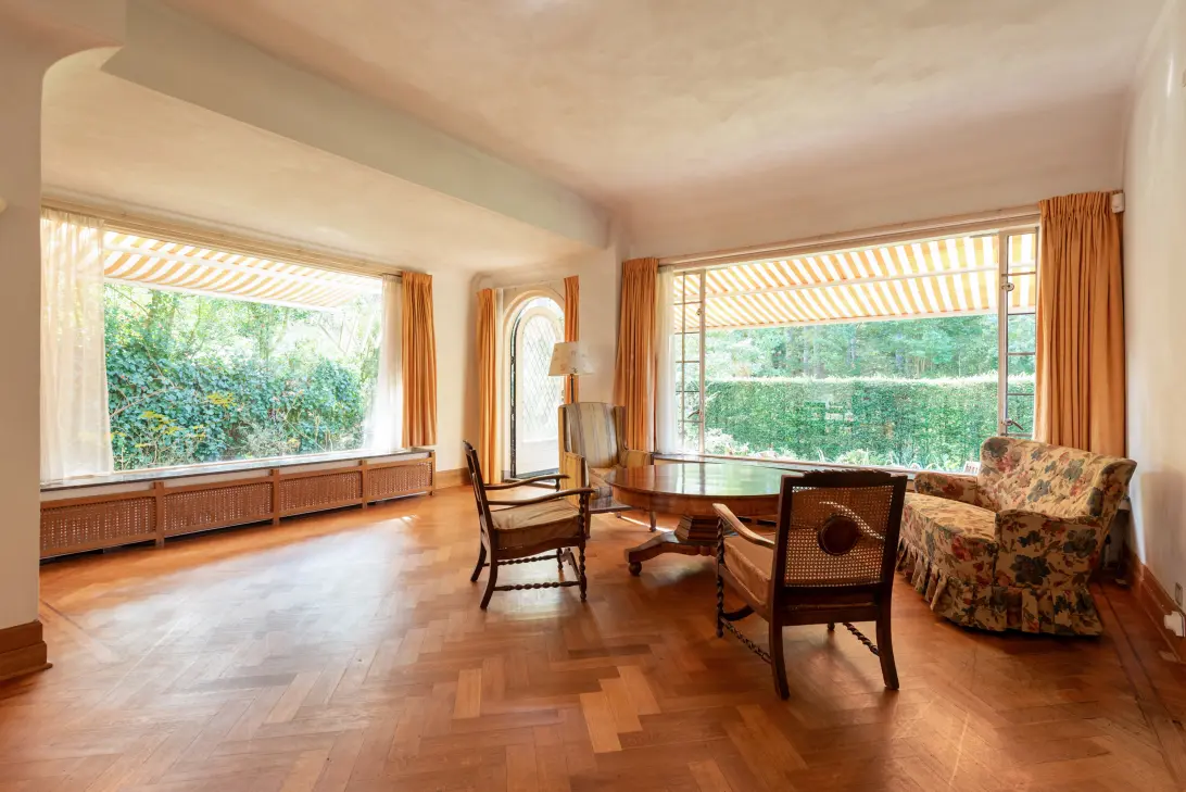 The garden wraps halfway around the house and is very sunny due to its free and open setting. In addition to the original garage, which was once connected to the dining room and could easily be reintegrated into the house, a newer, large garage has been added to the plot. This garage is suitable for many purposes, has an automatic overhead door, and provides passage to the back garden.