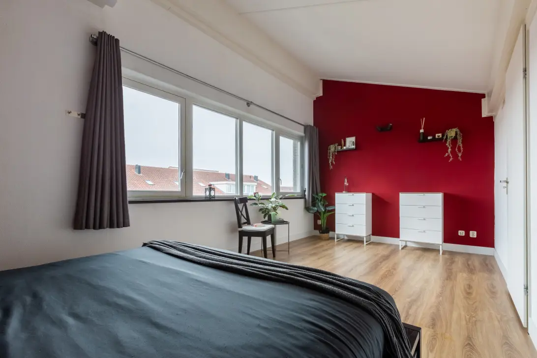 Via de open trap bereiken we deze verdieping. Hier is slaap-/werkkamer nummer 4 te vinden. Een fijne, goed afgewerkte, lichte kamer met een brede raampartij. Op de overloop is plaats voor de technische installatie en de aansluiting voor het witgoed.