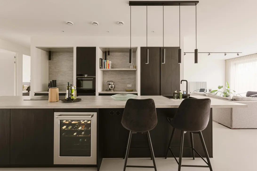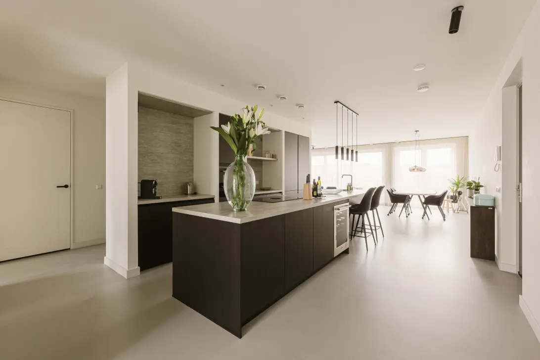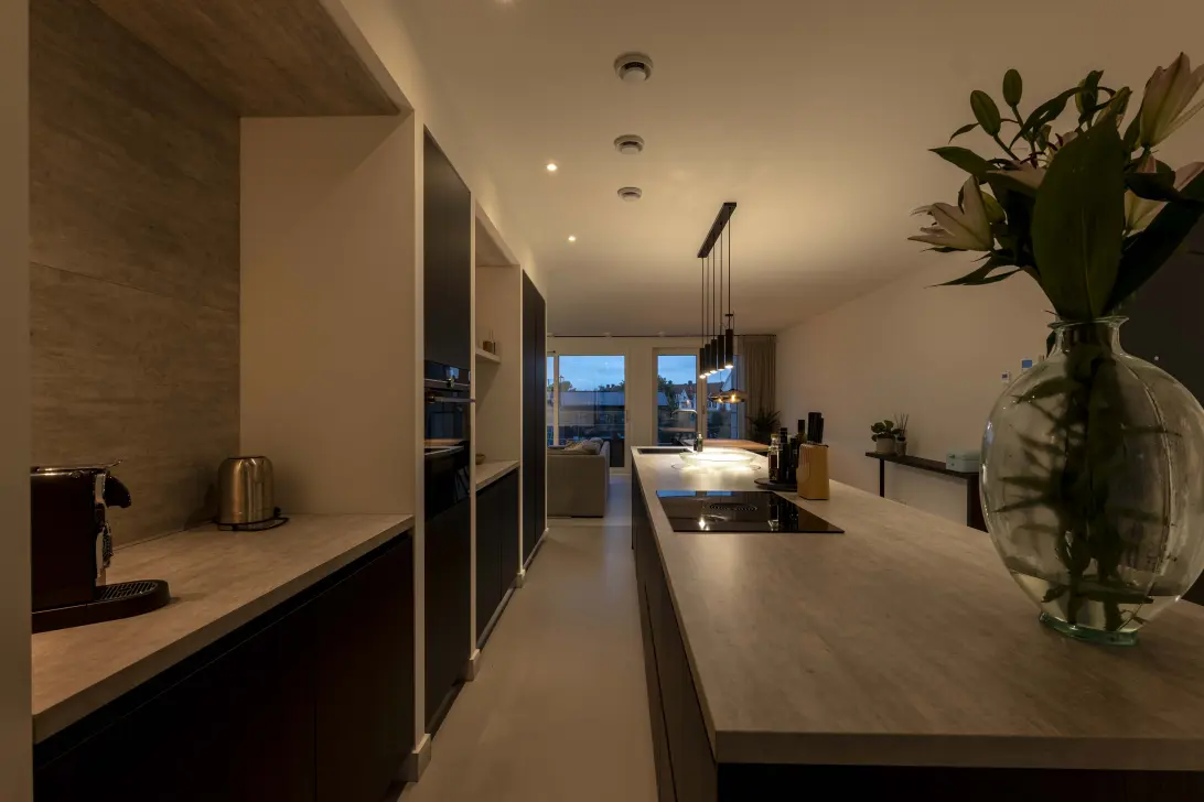 De woonetage is per lift te bereiken; entree naar de woning. Binnenkomst in de ruime en mooie woonkeuken. Deze is uitgevoerd in een stijlvolle donkere notenhouten kleur, gecombineerd met een beige marmeren blad. De keuken is de centrale verbindende factor van de hele woning. De leuke bar om aan te zitten is heerlijk om ’s avonds aan te ontspannen terwijl er gekookt wordt. Aan werkelijk alle comfort is gedacht qua designapparatuur, die subtiel is weggewerkt.