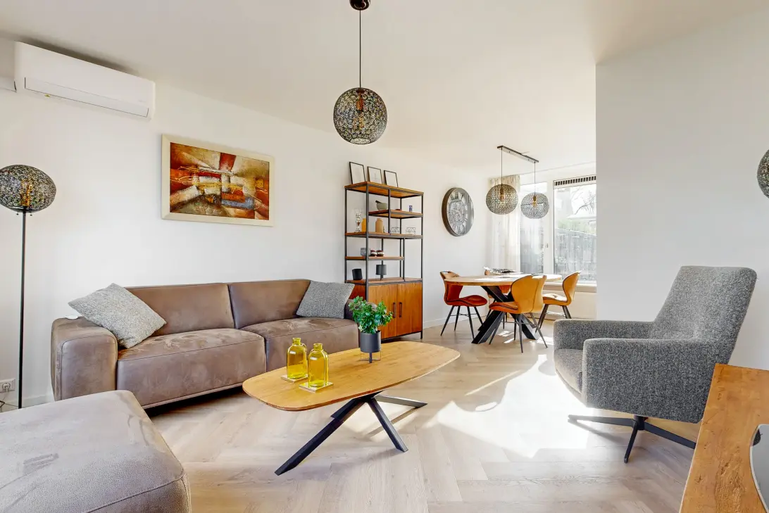 De woon-/eetkamer is heerlijk licht dankzij de grote raampartijen aan de voor- en achterzijde en voelt ruim en open aan. De aanwezige airconditioning zorgt bovendien voor extra comfort, zowel in de zomer als in de winter. De woonkamer staat in directe verbinding met de keuken via een ruim kookeiland, een echte eyecatcher en perfecte plek om te koken en gezellig samen te zijn.