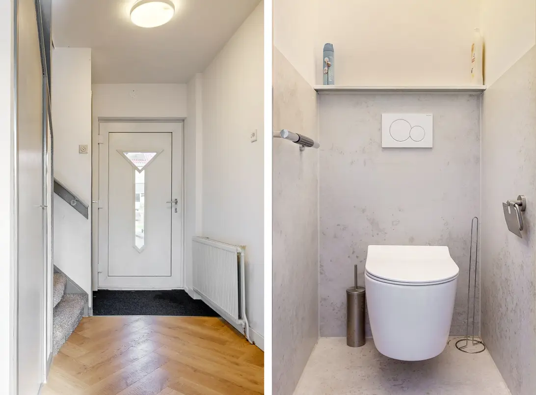 Je komt binnen in de hal met toegang tot het toilet, de meterkast, de trapkast en de trapopgang naar de eerste verdieping. Vanuit hier betreedt je de keuken en de woonkamer.