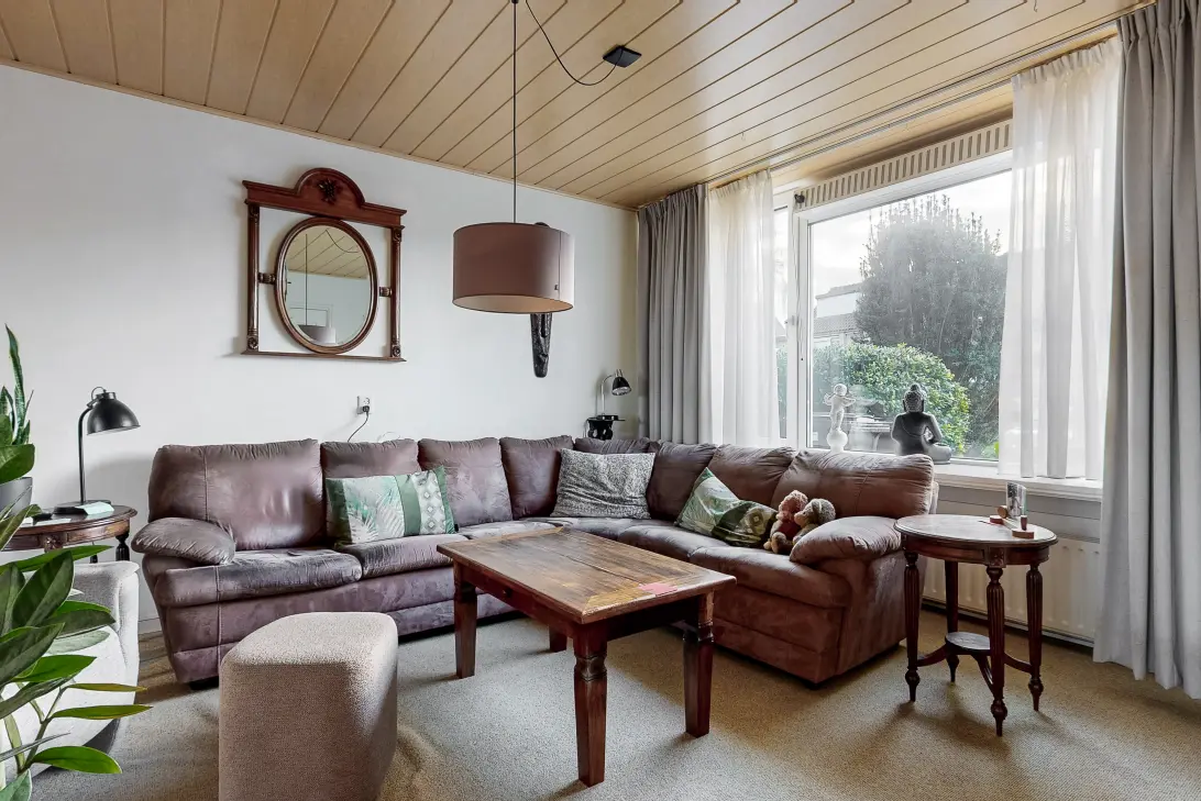 De lichte woonkamer kijkt uit over de voortuin en loopt door richting de gesloten keuken en de bijkeuken.