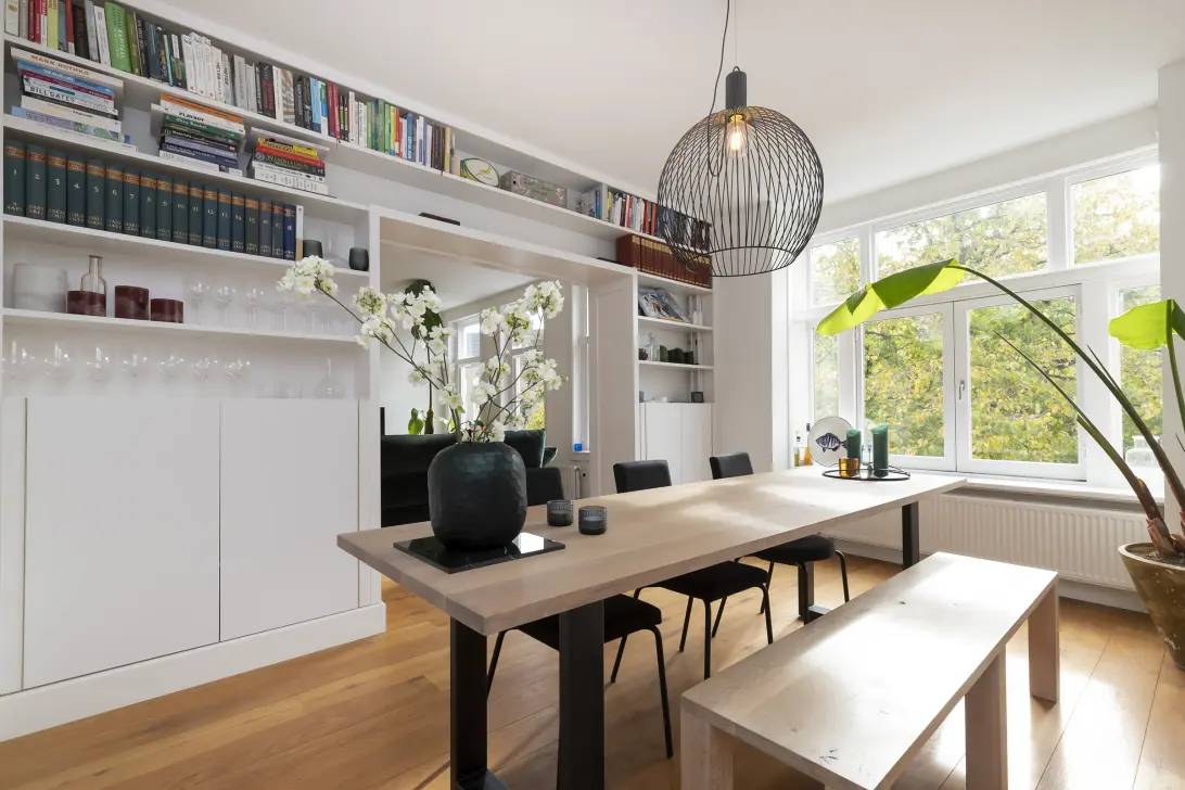 A stone staircase leads to the private entrance and front door of the apartment. At the front are the living and dining rooms, offering a beautiful open view over the greenery of Merwedeplein.
