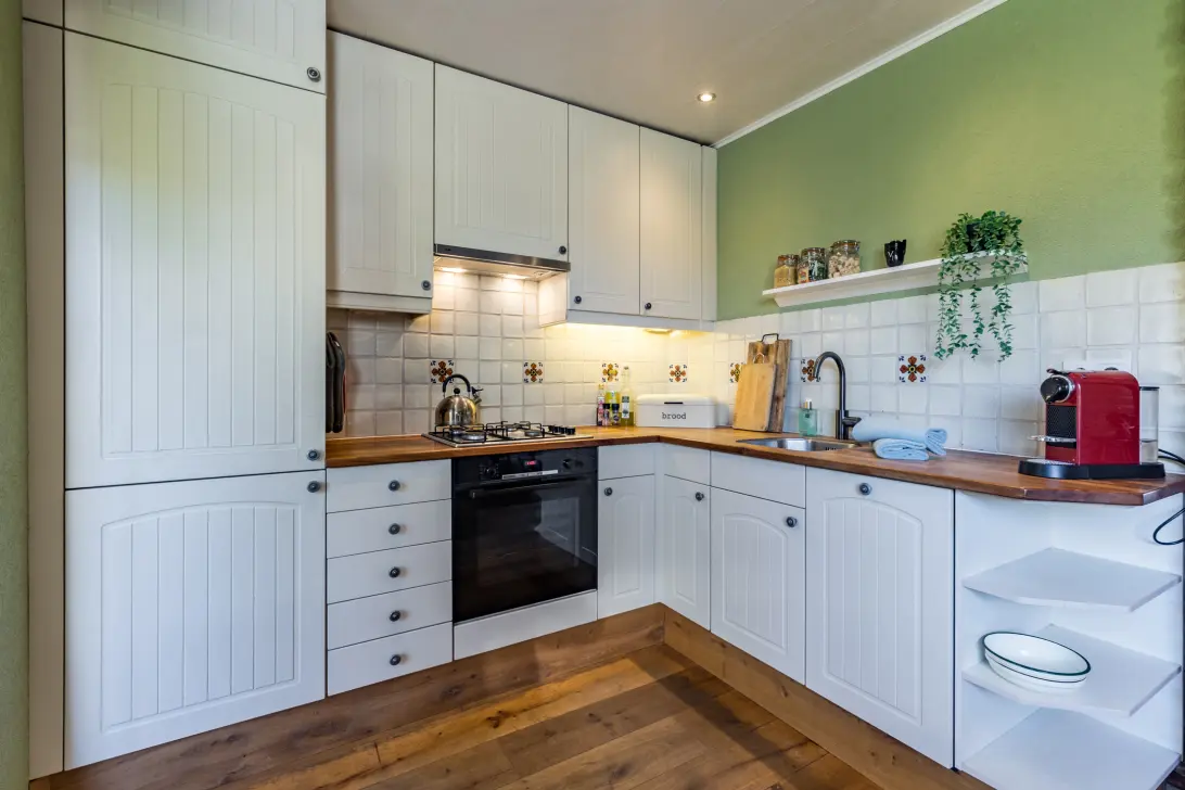 Apparatuur: Gaskookplaat, afzuigkap, vaatwasser, koelkast met vriesladen, oven