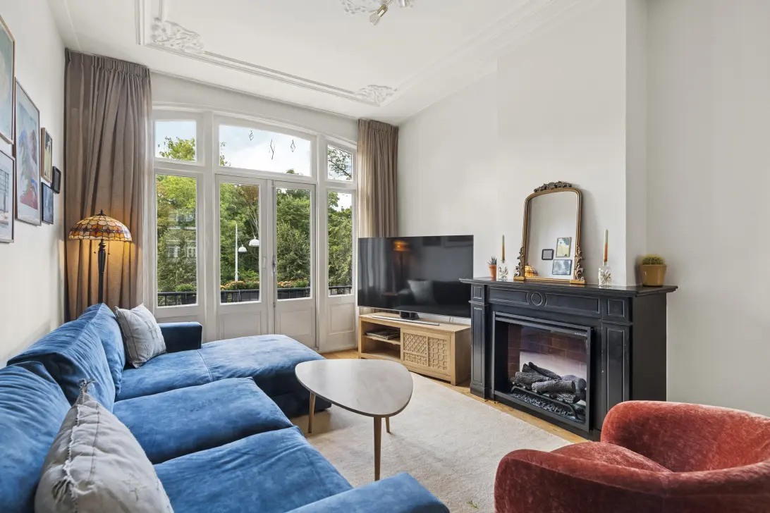 De imposante en royale woonkamer beslaat de volledige tweede verdieping en wordt gekenmerkt door veel natuurlijke lichtinval, originele en-suite deuren en een sfeervolle schouw met open haard (elektrisch). Aan de voorzijde bevindt zich een lichte hoekkamer, ideaal te gebruiken als hobby-, werk- of slaapkamer. Aan de achterzijde ligt de moderne woonkeuken met eiland. De keuken is uitgerust met diverse inbouwapparatuur, waaronder een prachtig Engels gasfornuis (Falcon), een composiet werkblad, spoelbak, vaatwasser, koelkast, vriezer, oven en volop kastruimte. Vanuit de woonkeuken geven openslaande deuren toegang tot een balkon aan de achterzijde, terwijl ook aan de voorzijde een balkon aanwezig is met uitzicht op Park Frankendael. Tevens beschikt deze verdieping over een separaat toilet.