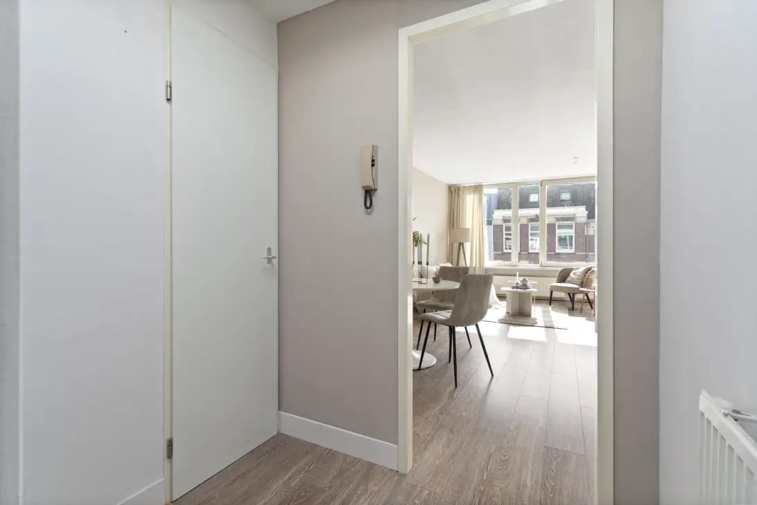 Via het nette gezamenlijke trappenhuis wordt de woning bereikt op de derde verdieping waar de hal nagenoeg alle vertrekken met elkaar verbindt. Hier zijn onder andere een ruime berging c.q. inloopkast en aparte w.c. beschikbaar.