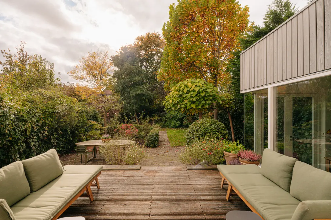 “Voor ons als gezin is de tuin echt het hoogtepunt van het wonen hier. Het is altijd zonnig en licht, bloemen bloeien er welig (rozen, clematis, hortensia, rododendron). Wij hebben er lange zomeravonden doorgebracht met familie en vrienden; we hebben gebarbecued, geborreld, verjaardagen gevierd en hutten gebouwd. Of, met een vestje nog aan, in de prille lente aan het paasontbijt.