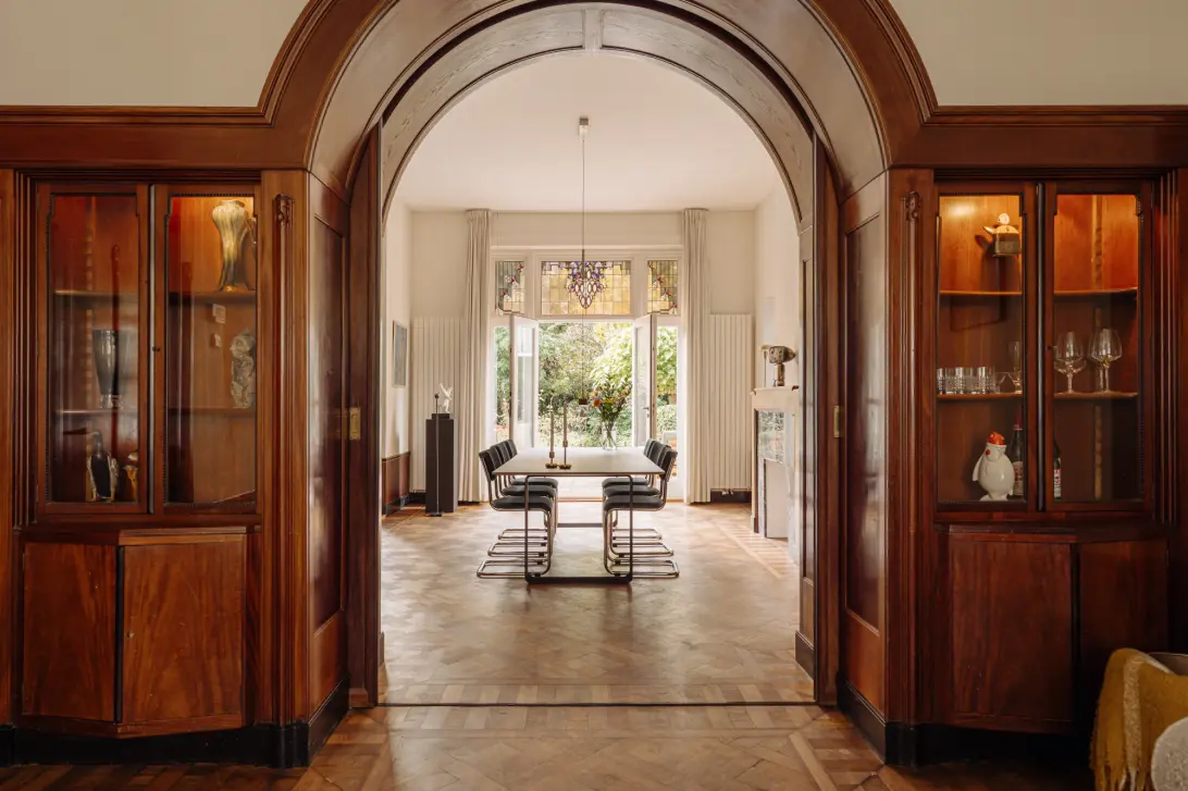 De woning beschikt over een eigen oprit met plaats voor twee auto’s en een voortuin die het statige aanzicht extra cachet geeft. De authentieke details – zoals de markante erker in de voorgevel, glas-in-loodramen en een marmeren vestibule – vormen de toonzetting voor wat binnen volgt.