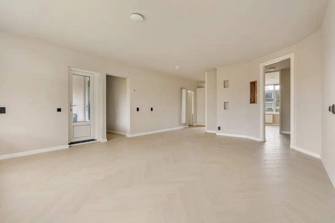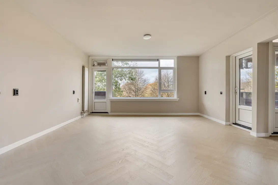 De royale woonkamer vormt samen met de open keuken het hart van het huis. Dankzij de grote ramen is er veel lichtinval en een vrij uitzicht op het groen rondom. Vanuit de woonkamer zijn beide balkons bereikbaar, waar je heerlijk kunt genieten van de rust en het uitzicht over de groene omgeving.