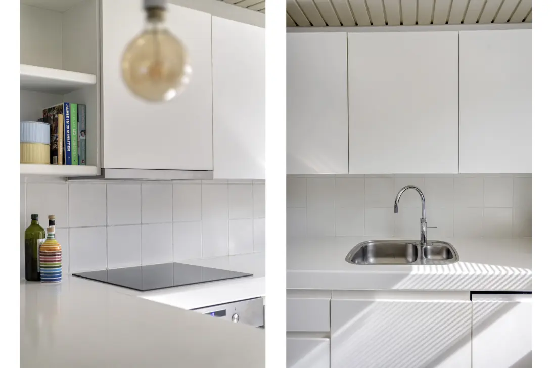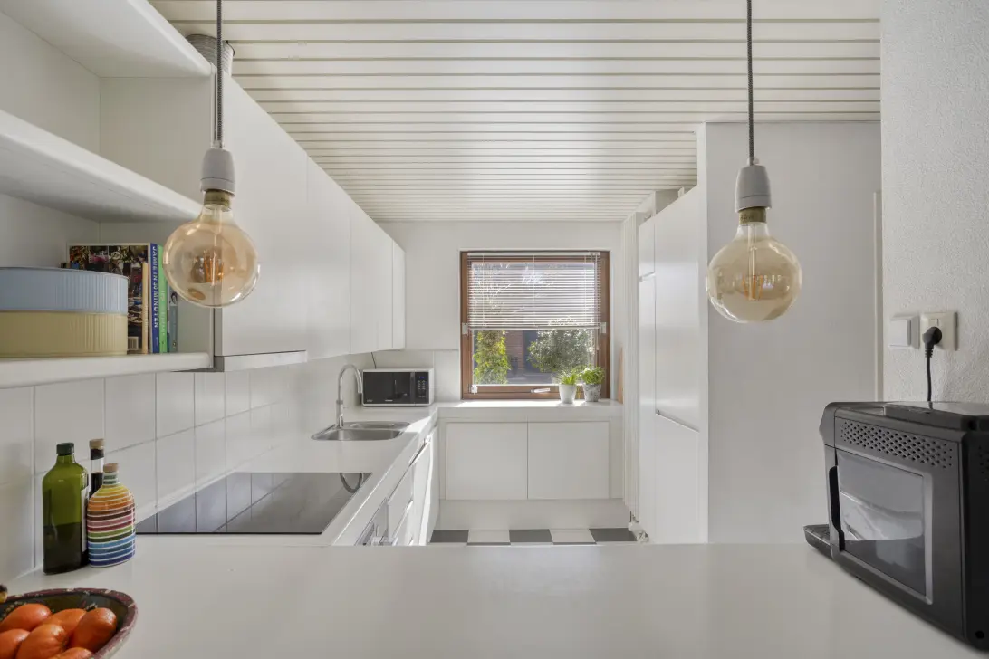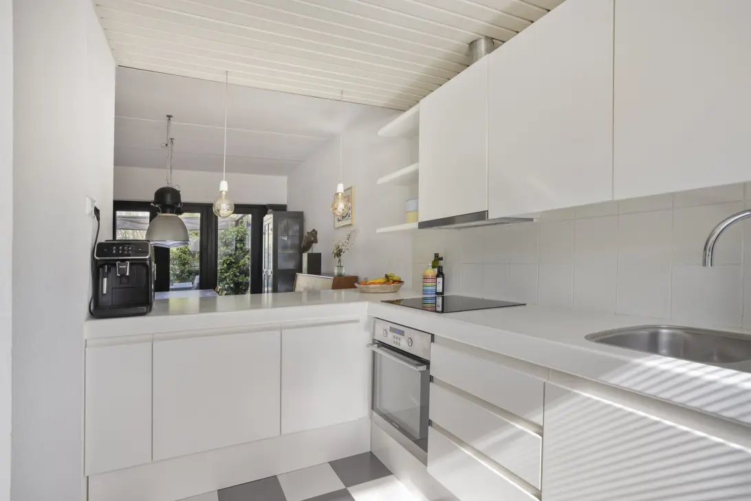 De keuken bevindt zich aan de voorzijde van de woning en is uitgerust met diverse inbouwapparatuur, waaronder een oven, quooker, elektrische kookplaat en vaatwasser. De eethoek sluit hier naadloos op aan en staat in directe verbinding met de keuken. De lichte, open leefruimte is voorzien van een houten parketvloer (schuren van de vloer is mogelijk) en een sfeervolle open haard. Via de harmonicadeuren in de achtergevel heb je toegang tot de verzorgde, diepe achtertuin op het westen. Dankzij deze gunstige ligging geniet je hier van de zon vanaf het begin van de middag tot in de avonduren, ideaal om optimaal van het buitenleven te genieten.