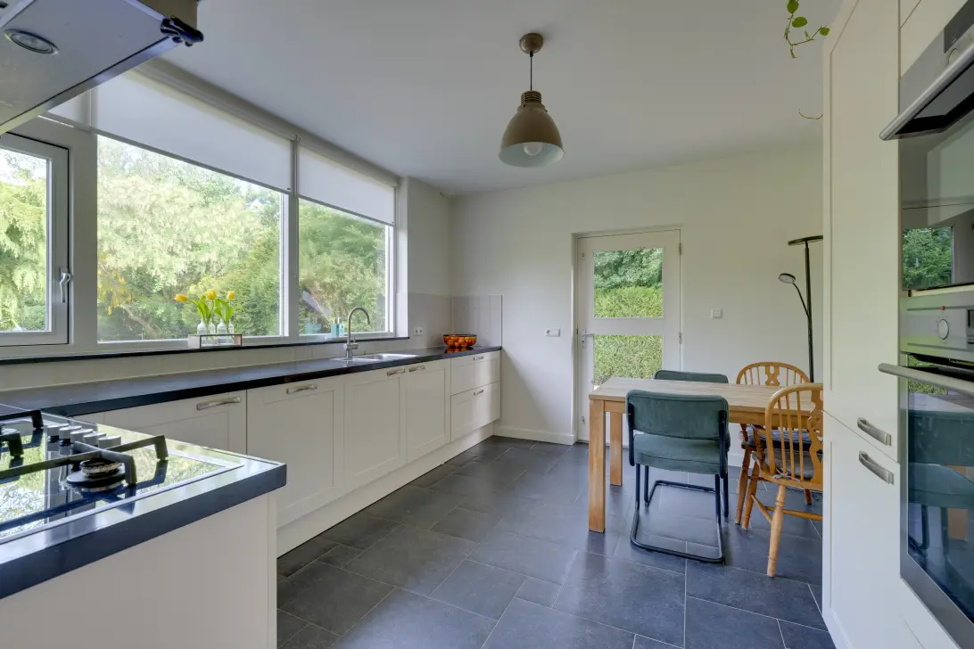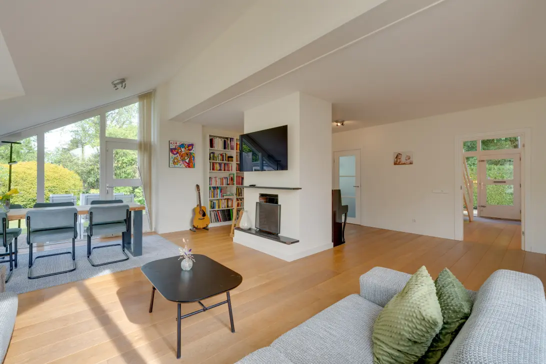 De woonkamer is ruim en licht en voorzien van een eikenhouten parketvloer met vloerverwarming. Aan de linkerkant vindt u een ruime studeer-/speelkamer met uitzicht op de tuin. Vanuit de woonkamer komt u in de keuken. De woonkeuken is voorzien van alle gemakken en biedt ruimte aan een eettafel.