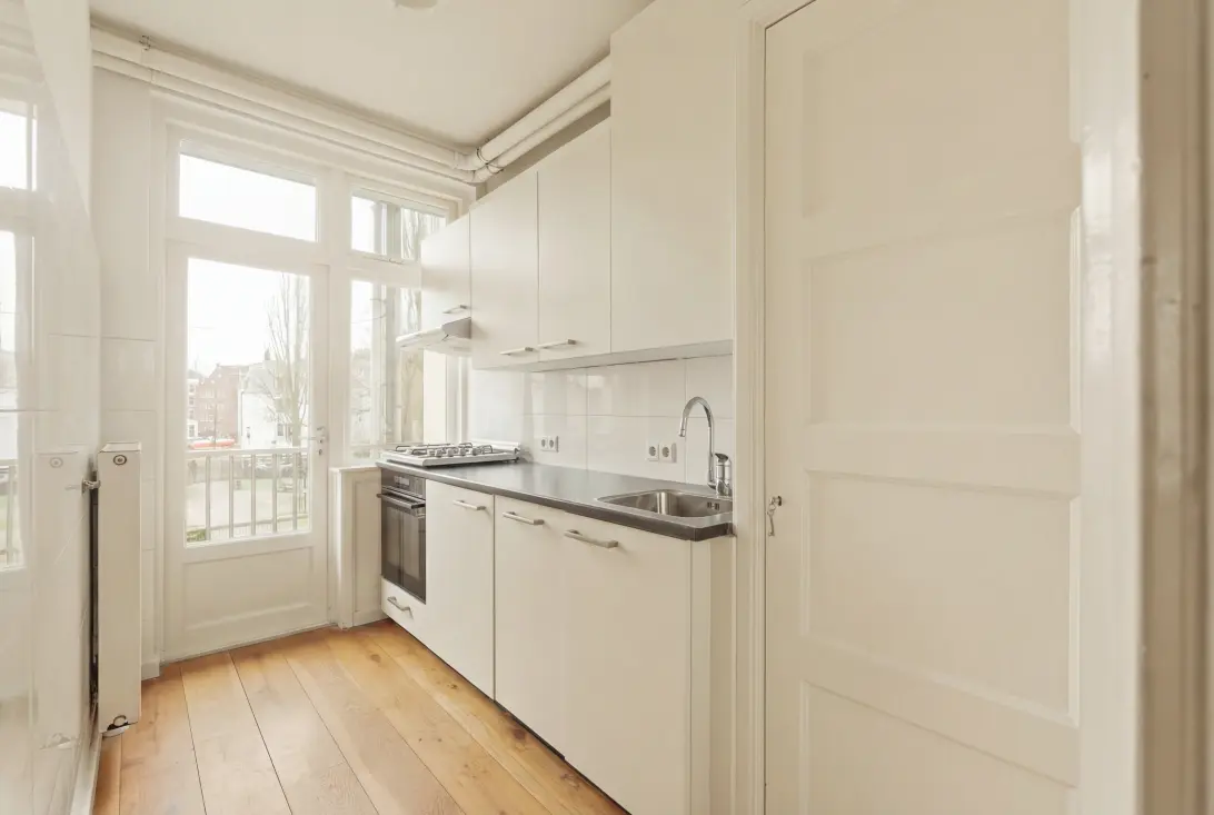 Aan de achterzijde bevinden zich de gesloten keuken en één van de slaapkamers. Vanuit beide ruimtes is het achtergelegen balkon toegankelijk. Het balkon ligt op het zuidoosten en biedt een fijne plek in de zon. Daarnaast is er een praktische balkonkast aanwezig. De keuken is voorzien van een 4-pits gasfornuis, afzuigkap, vaatwasser, combi-oven/magnetron en een koelkast met vriesvak. Hier bevinden zich tevens de CV-opstelling (Nefit) en de aansluiting voor de wasmachine.