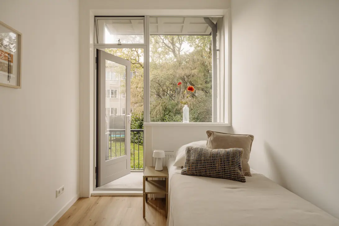The Montferlandstraat is located in the Veluwebuurt, which is part of the very popular Rivierenbuurt. Several streets in this neighborhood were named after Dutch regions. Architect J.F. Berghoef designed the Airey houses after the Second World War and built them in 1951/1952. The apartment is located in a part of the Amstelhof complex, which was declared a municipal monument in 2014. Over the years, the Maasstraat and Scheldestraat have grown into the center of the neighborhood. Especially the nautical brasserie Vis aan de Schelde attracts culinary enthusiasts from inside and outside the city. The same applies to ice cream parlors Venetië and Pisa IJs, which open their doors again every year with the arrival of spring. Theater festival De Parade descends every summer in the Martin Luther King Park; the green backyard of the neighborhood with a view over the Amstel. In addition, the Beatrix and Amstel parks can also be reached within a few minutes’ walk.