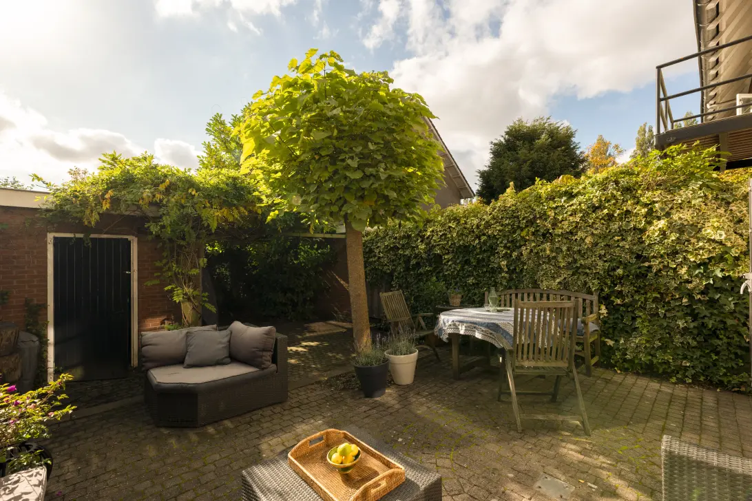 De zonnige achtertuin beschikt over een praktische stenen schuur (ideaal voor fietsen of tuinspullen) en een handige achterom. De tuin is gelegen op het zuiden en heeft zon van ca. 9 uur s'ochtends tot 7 uur 's avonds.