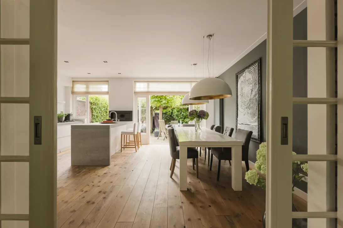 The spacious, bright L-shaped living room features beautiful wooden flooring, a cosy fireplace and a modern open-plan kitchen with an island at the rear. The kitchen is luxuriously equipped with a 5-burner gas hob, Quooker, built-in soap dispenser, dishwasher, Miele oven, extractor hood, fridge and freezer. The centrally located island also has a built-in power socket – handy when cooking or working in the kitchen. Thanks to the large windows and French doors to the garden, you can enjoy plenty of light and a pleasant connection with the outdoors.