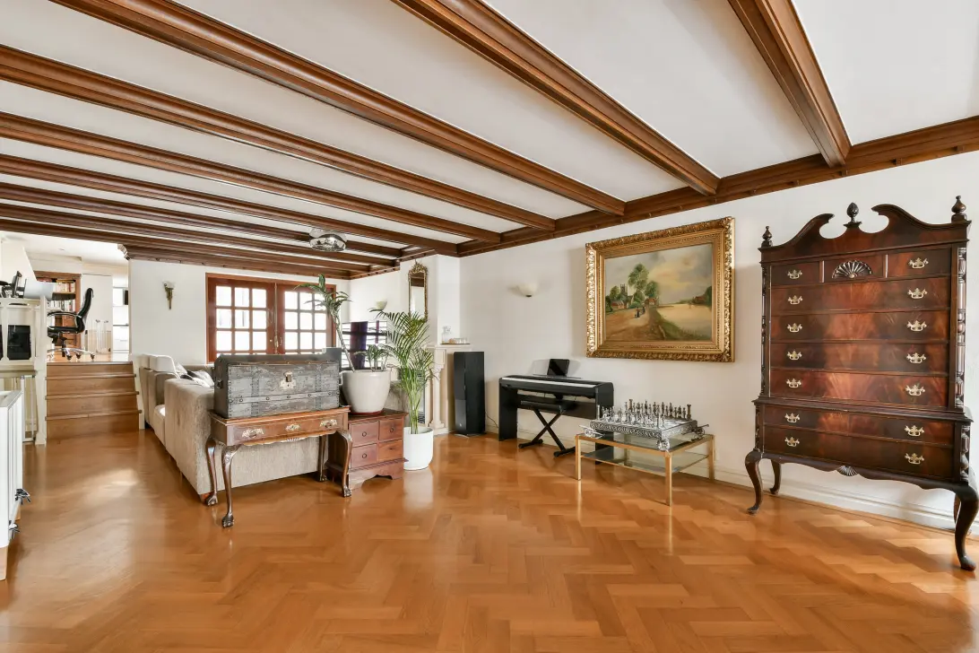 The entrance on the bel-etage provides direct access to a spacious and atmospheric living room, featuring beautiful authentic details such as a classic fireplace and exposed wooden beams. The room is finished with a parquet floor and offers access to a terrace through French doors.