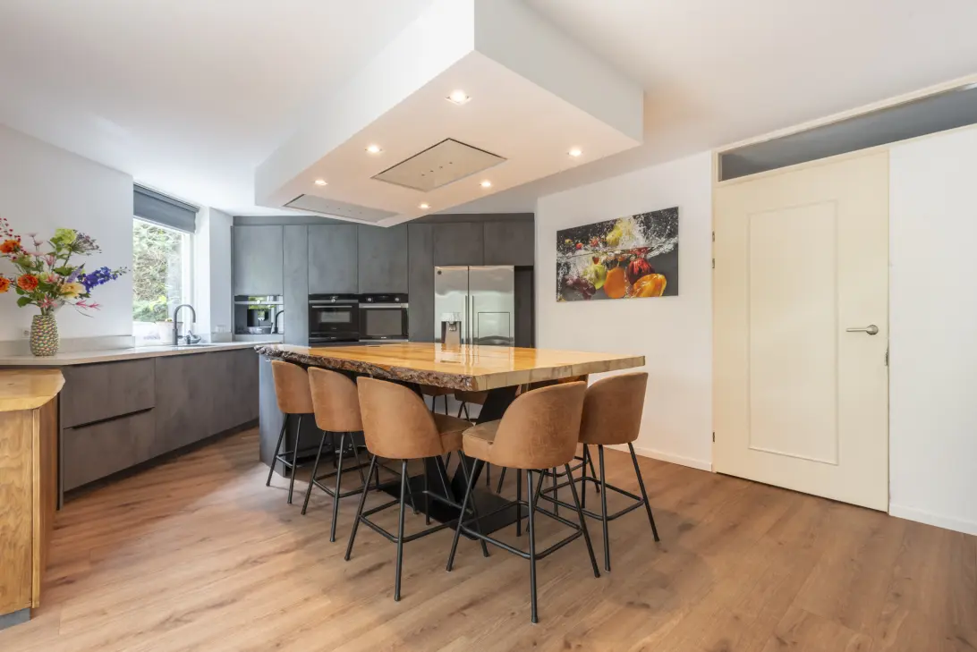 De woonkeuken beschikt over diverse luxe inbouwapparatuur, waaronder een inductie flexplaat waar u met gemak vijf pannen op kwijt kunt, één afzuigkap boven de kookplaat en één boven de eettafel, vaatwasser en een losse Amerikaanse koel-/vriescombinatie met ijsklontjes en koud water uitgifte. De inpandig te bereiken garage is praktisch ingericht met wasmachine aansluiting, extra bergruimte en directe toegang tot de tuin.