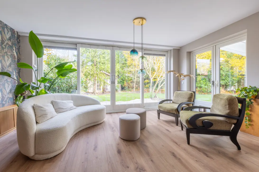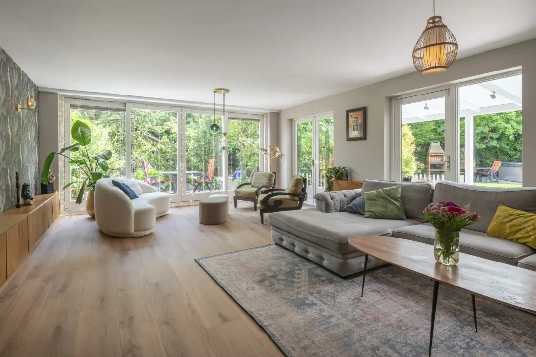 Aan de woning grenst een veranda die op stijlvolle wijze de verbinding vormt tussen het binnen- en buitenleven.