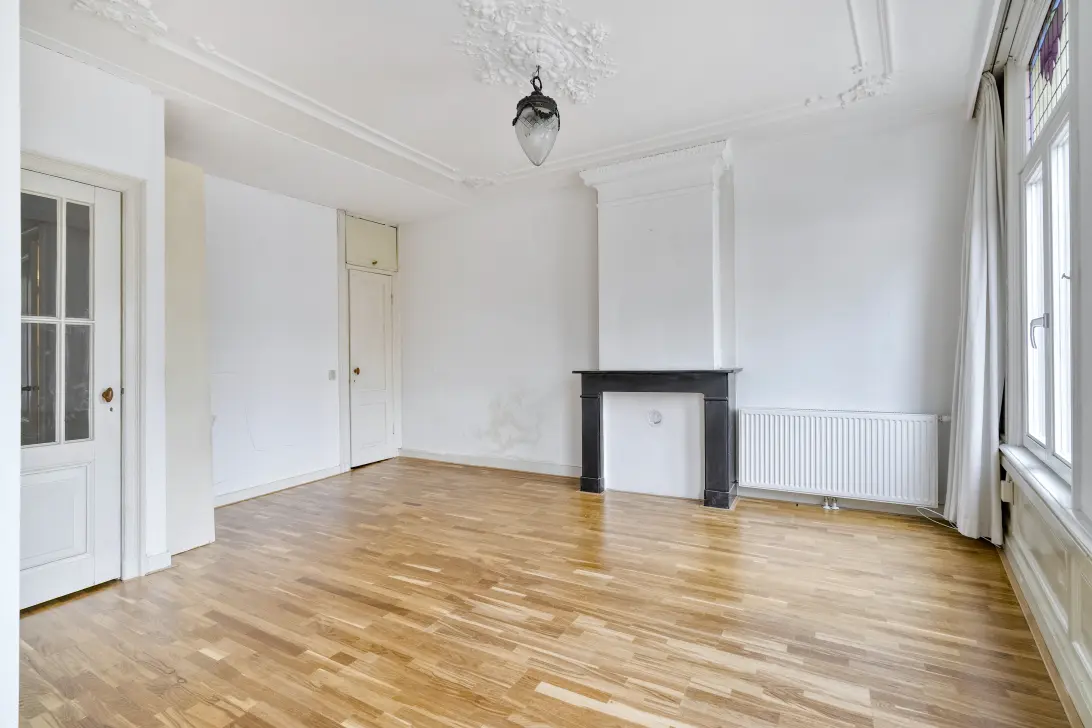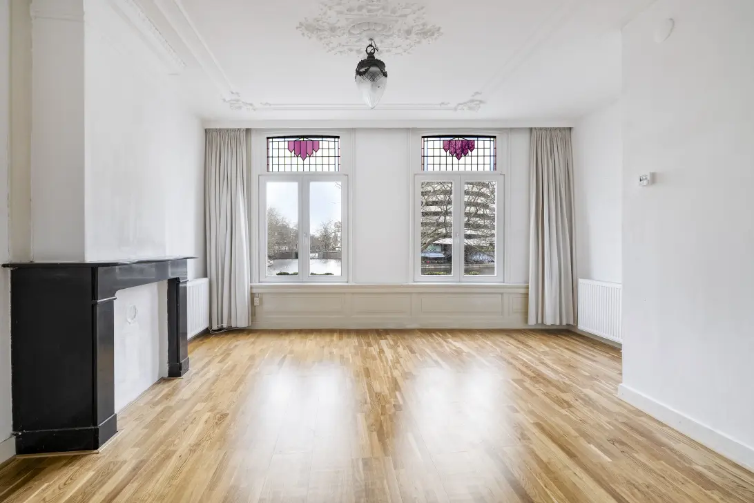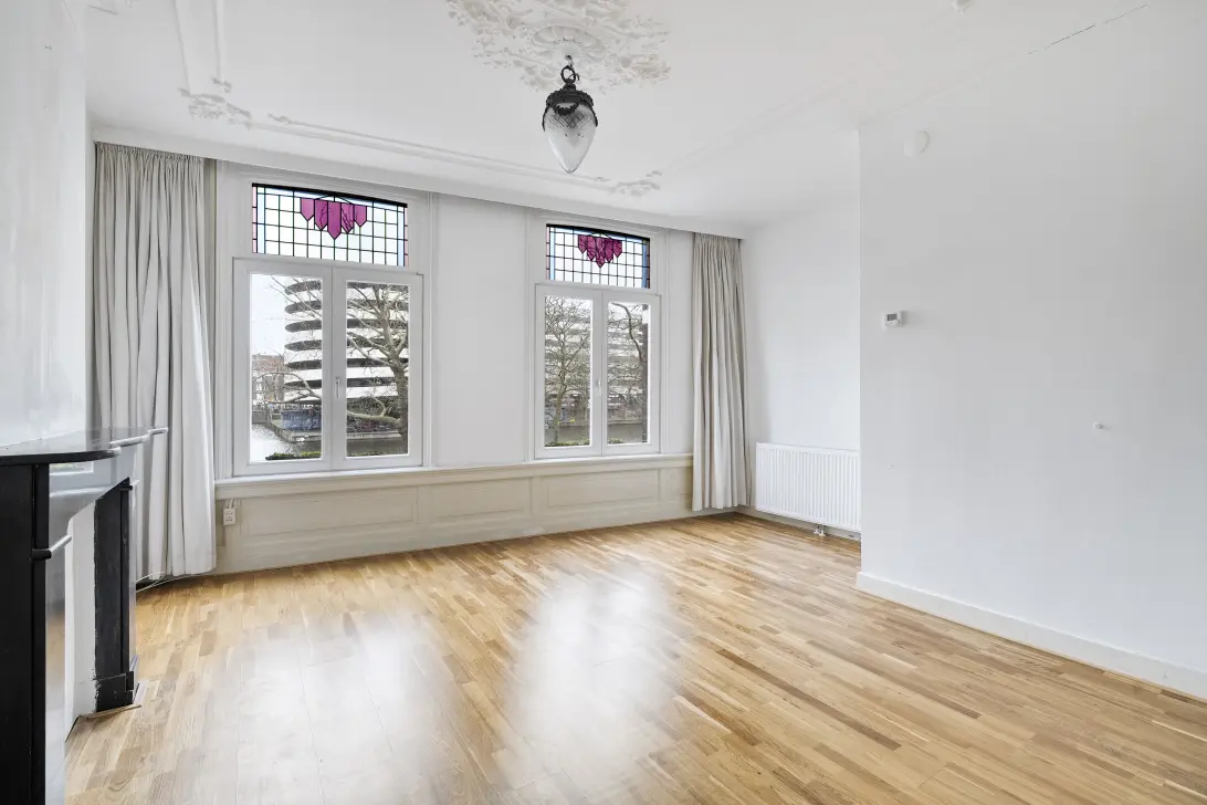 Through the communal entrance you reach the first floor. Upon entering, the hallway provides access to all rooms. At the front is the spacious living room, where large windows allow plenty of daylight and offer a lively view of the Nassaukade and the water. The bedroom at the quiet rear side offers great comfort and features original details such as decorative elements and stained-glass transom windows.