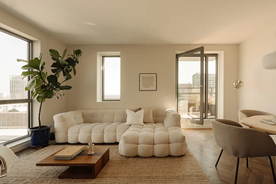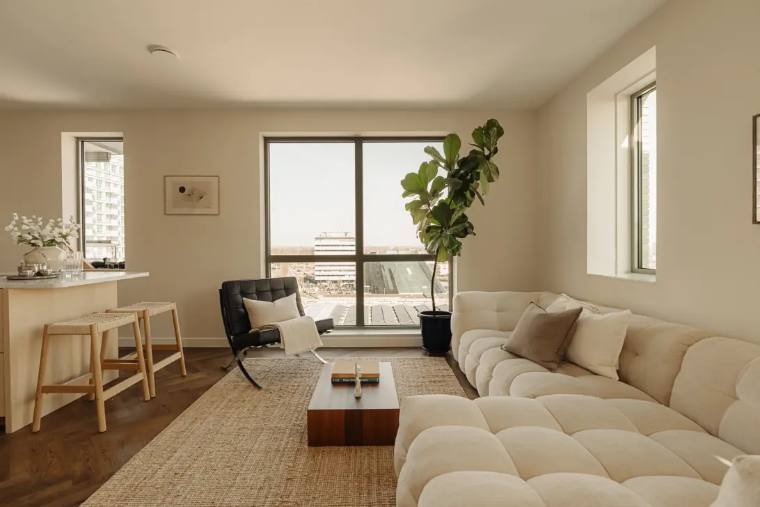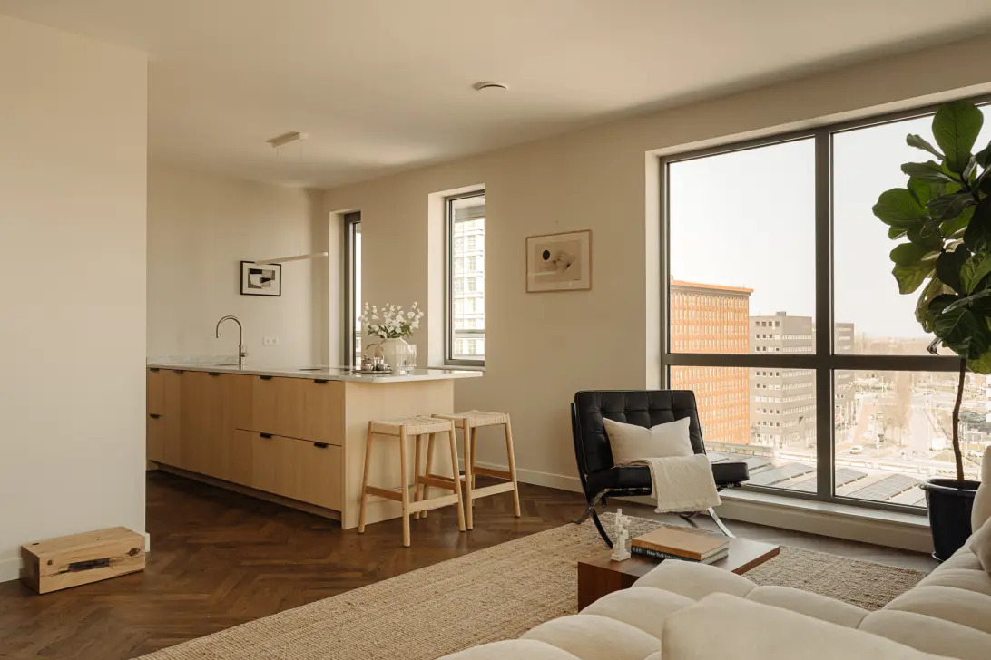 De woonkamer heeft door de hoekligging veel natuurlijke lichtinval en geeft toegang tot de twee balkons. De gehele woning is voorzien van een visgraatvloer van multiplank met massief eiken toplaag, gelegd door 'Echt Parket' en afgewerkt met hoogwaardige Rubio Monocoat-olie.