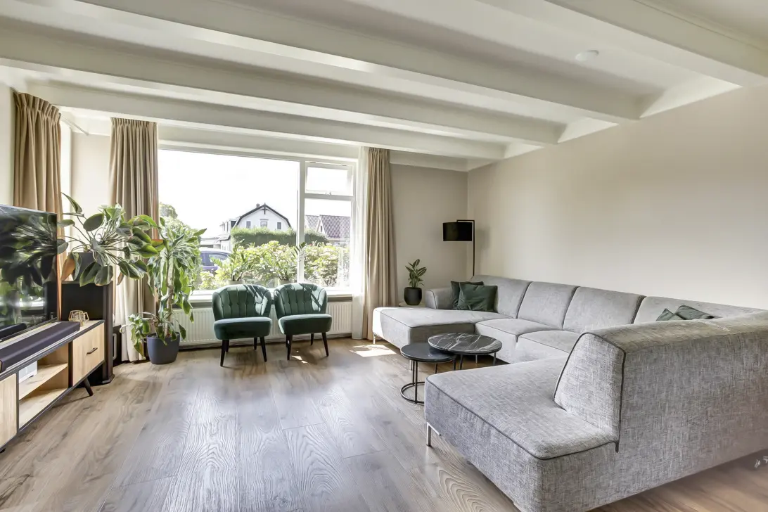 Begane grond: Bij binnenkomst via de aangebouwde entree word je direct verrast door de ruimte en het vele licht dat hier binnenvalt dankzij het grote raam. Deze ruimte leent zich uitstekend als kantoor of werkplek, waar je in alle rust kunt werken. Vanuit de entree stap je de sfeervolle leefruimte binnen. Hier komen comfort en karakter samen met de strak gestuukte wanden, een prachtig balkenplafond en een warme pvc-vloer met vloerverwarming zorgen voor een huiselijke en stijlvolle uitstraling. Met de airconditioning regel je het binnenklimaat eenvoudig naar wens. Aan de achterzijde vind je de moderne keuken, opgesteld in een praktische U-vorm. Hierdoor beschik je over veel werk- én opbergruimte. De keuken is compleet uitgerust met een inductiekookplaat, afzuigkap, oven, koel-/vriescombinatie, vaatwasser en Quooker.