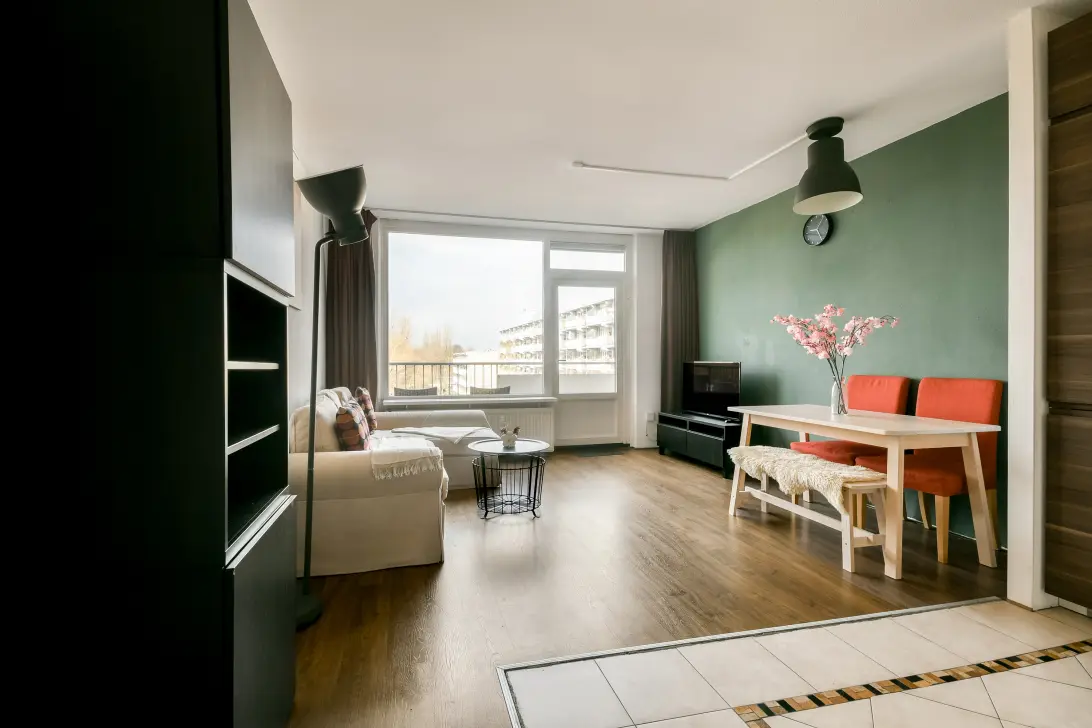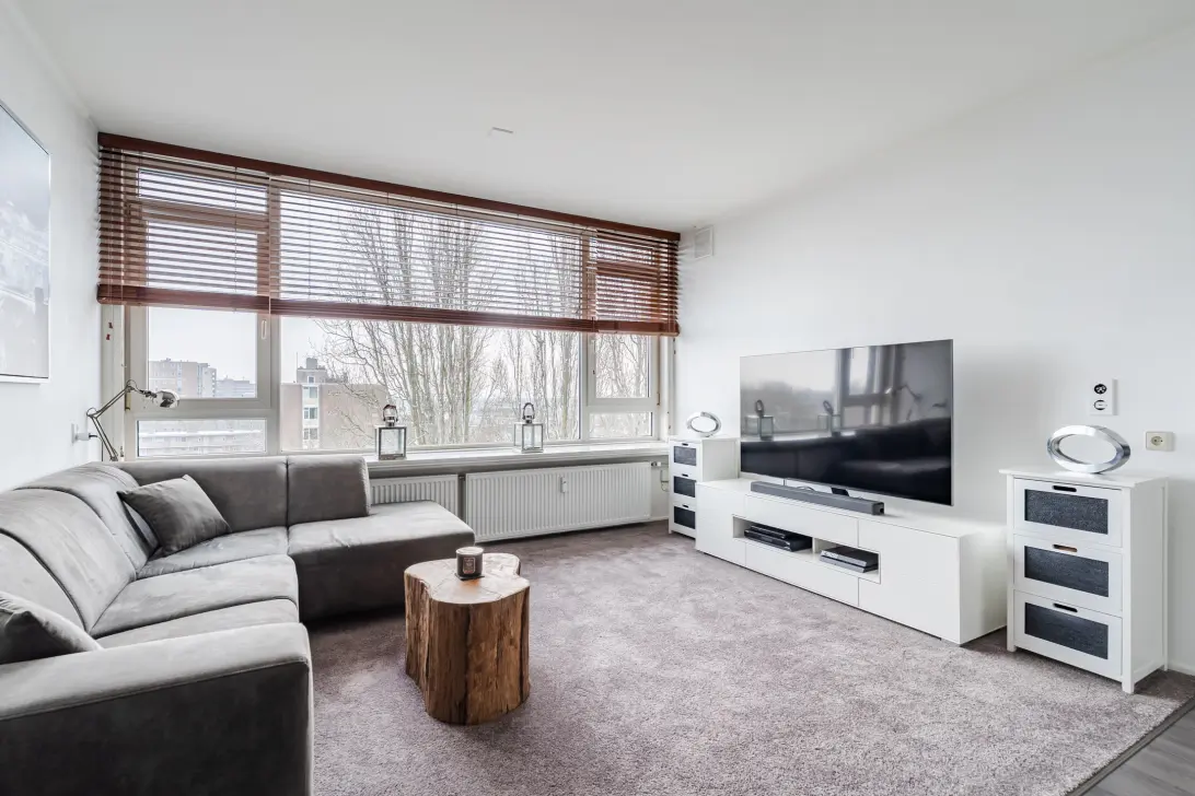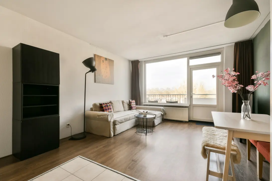 This well-maintained two-room apartment is located on the fourth and top floor of a small apartment building with an elevator. The apartment features a well-maintained, bright entrance hall, a spacious living room with laminate flooring and access to a west-facing balcony, a compact open-plan kitchen with built-in appliances, a bedroom with built-in wardrobes, and a bathroom. Nearby is the Groenhof shopping center, with three large supermarkets and several other shops. Amstelveen Hospital is also nearby. The Stadshart district, with its diverse shops, restaurants, library, bus station, and the Schouwburg theater, is within cycling distance. Public transport, including various bus connections to Amsterdam city center, Schiphol Airport, and the new Amstelveen line to Amsterdam, is just 100 meters away, and major roads (including the A9, A2, and Beneluxbaan) are quickly and easily accessible. The sports complex and swimming pool "De Meerkamp" and the International School are also nearby.
