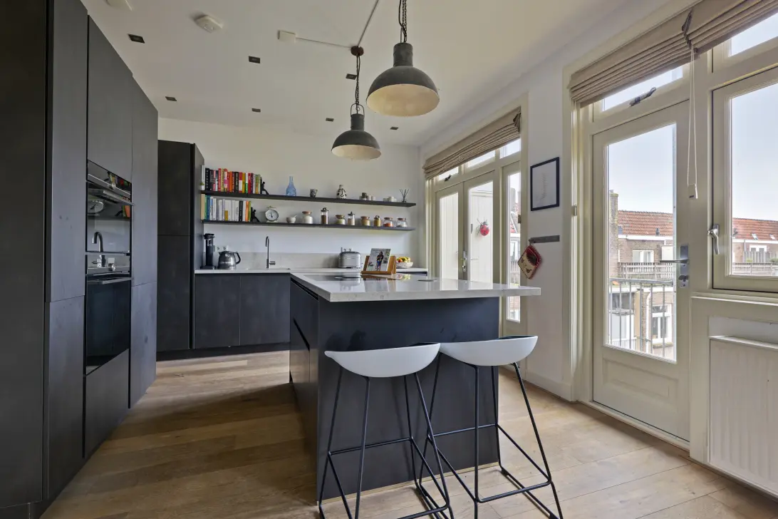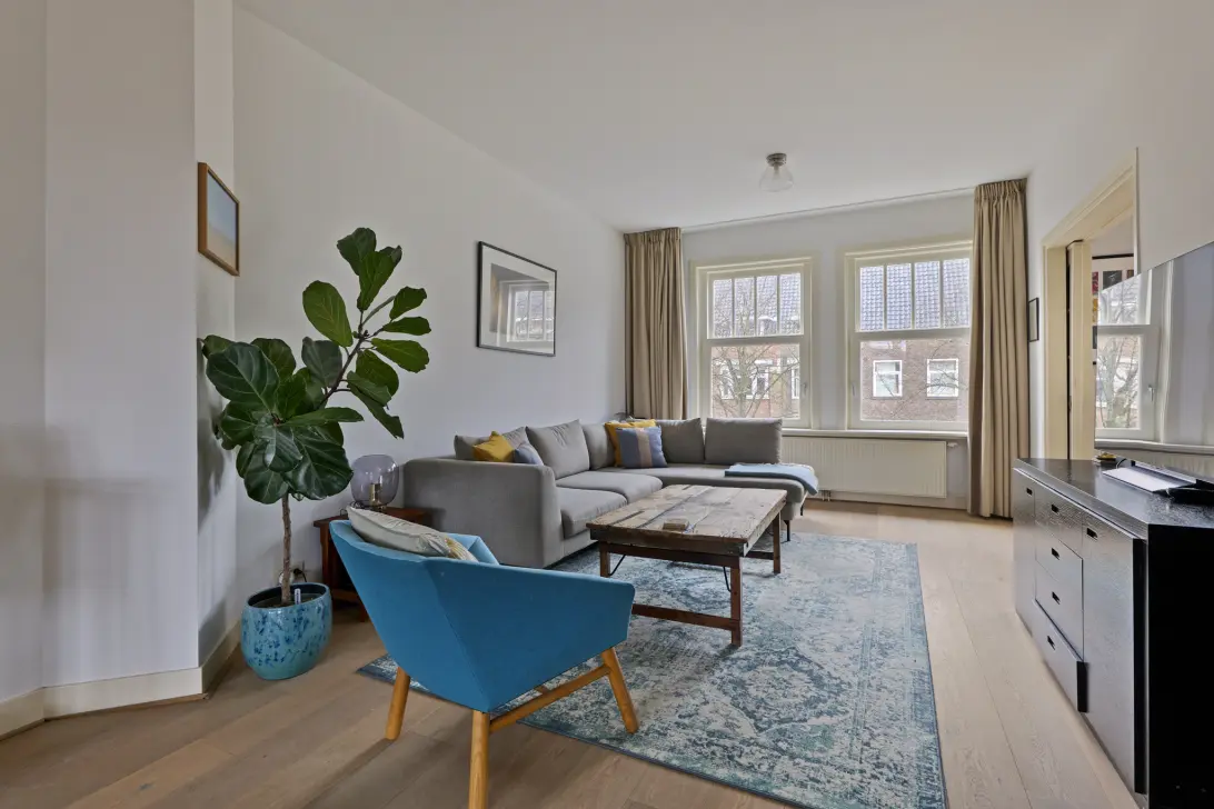 De royale, lichte woonverdieping met een ruimte beleving heeft de woonkamer aan de voorzijde. Fraaie, originele glas in lood deuren scheiden de woonkamer van de grote zijkamer welke momenteel in gebruik is als werk-/speelkamer. Aan de achterzijde van de woning is het eetgedeelte gelegen met de grote luxe keuken voorzien van diverse inbouwapparatuur. Vanuit de keuken kom je in de super handige bijkeuken (met wasmachine aansluiting), een ideaal en praktisch verlengstuk van de keuken. Het zonnige balkon over de volle breedte van het pand heeft een fraai uitzicht over de groene binnentuinen.