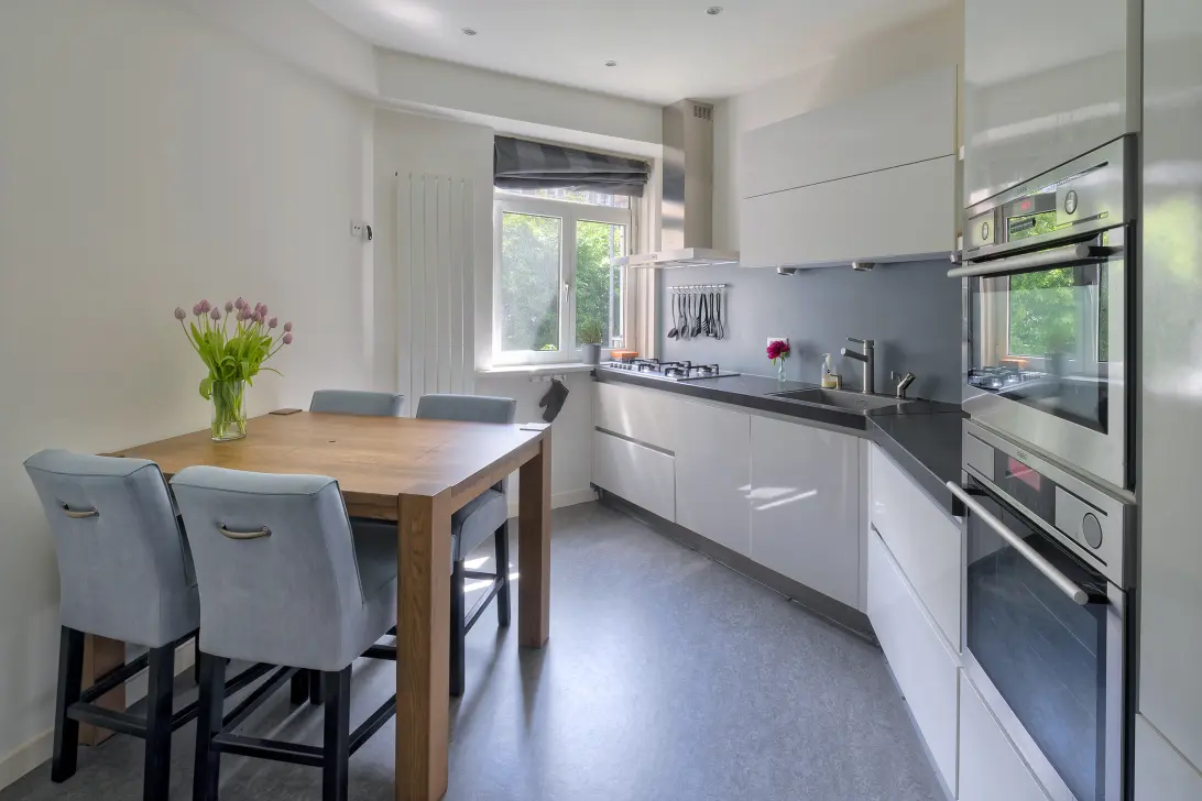 First floor: entrance hall, cloakroom, separate toilet with a wall-hung toilet and a small sink. The living room is located at the front of the apartment and, thanks to its corner location and large windows on both Dintelstraat and Niersstraat, is exceptionally bright. The two spacious bedrooms both have built-in wardrobes. The luxurious kitchen/diner is located at the rear of the building and is equipped with a fridge/freezer, 5-burner gas cooktop, extractor hood, dishwasher, Quooker, steam oven, and combination microwave. The modern bathroom features a walk-in rain shower, designer radiator, double sink, and a washing machine and dryer.