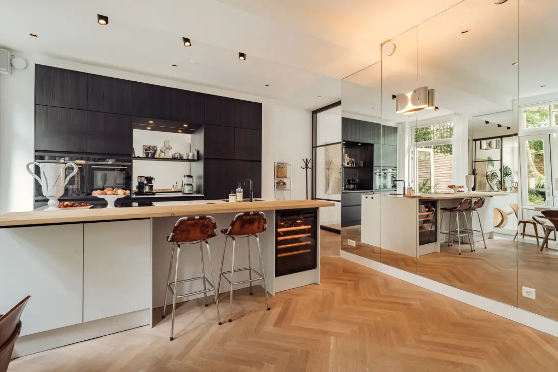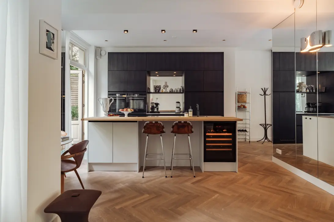 Aan de achterzijde bevindt zich de ruime leefkeuken met kookeiland en bar die van alle gemakken is voorzien (apparatuur van Siemens en BORA): 2 stoomovens, inductieplaat met afzuiging, Quooker, vaatwasser, grote koelkast, grote vriezer en zeer veel opberg- en werkruimte.