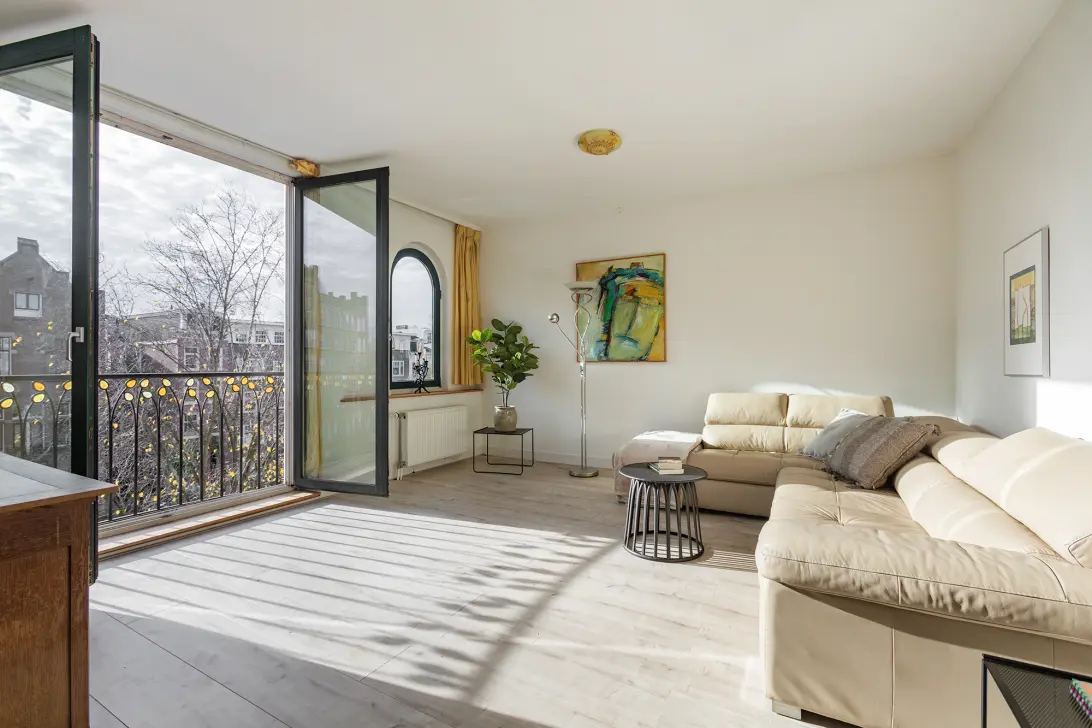 Het appartement, ligt op de derde en hoogste verdieping van een karakteristiek pand aan de Nieuwe Achtergracht. Zodra je binnenkomt, valt het licht en de rust direct op. De woonkamer, met drie grote ramen en openslaande deuren naar het Franse balkon, biedt uitzicht op de gracht en de historische brandweerkazerne. Dankzij de breedte van de woonkamer, hoge plafonds (2,60 m) en de rustige ligging aan de autoluwe straat, voelt de ruimte royaal en sereen aan. Een fijne plek om te wonen en te werken.