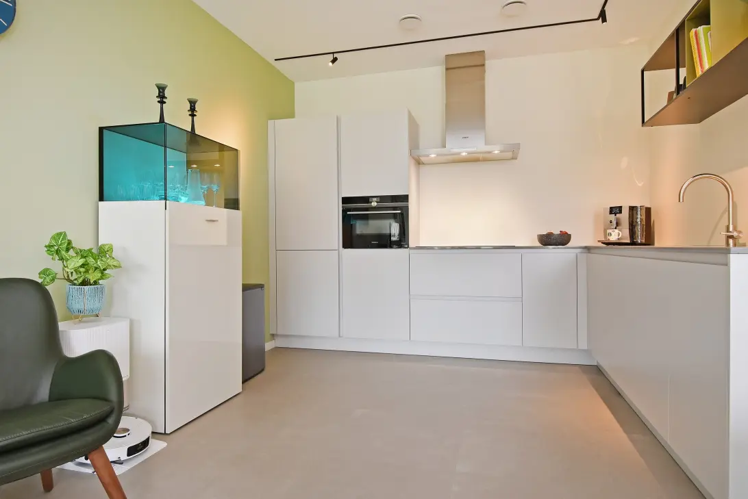 Entree van de woning met hal, meterkast, berging/technische ruimte met opstelplaats voor de warmtepomp (huur) en de WTW-installatie. Tevens is er een separate toiletruimte aanwezig. In de gang is nog een praktische berging waar ook de wasmachine staat. Via de hal betreedt u de lichte woonkamer met open keuken. De keuken is uitgerust met diverse inbouwapparatuur, veel bergruimte en ruim werkblad. Vanuit de woonkamer heeft u toegang tot een heerlijk en zonnig balkon gesitueerd op het zuidwesten – ideaal voor middag- en avondzon.