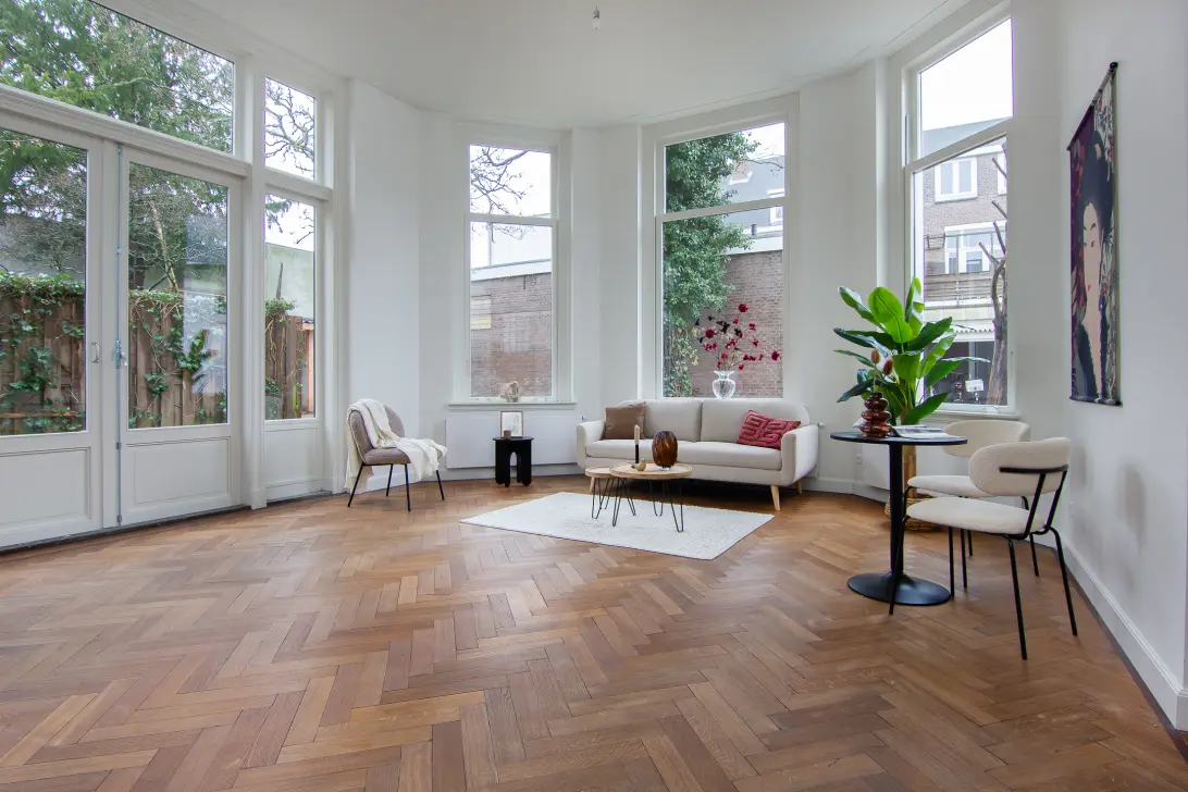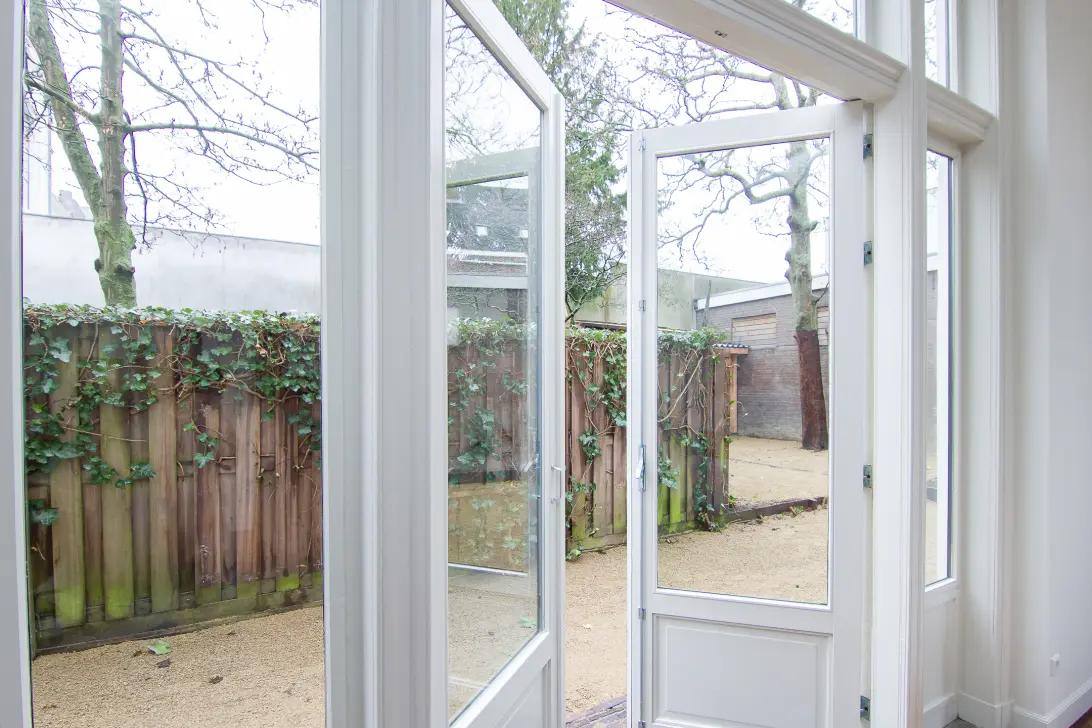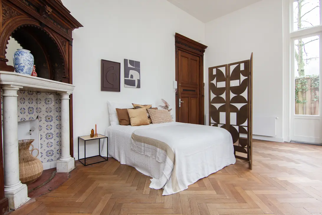Het fijne appartement op de begane grond heeft een ruime woon-/slaapkamer met authentieke schouw, prachtige houten vloer in Hongaarse punt. De hoge ramen en openslaande deuren zijn allemaal voorzien van HR-glas en alle buitenmuren zijn geïsoleerd. Dit is, samen met het schilderwerk aan de binnenzijde, eind 2025 gedaan. Er is een half open keuken en een strakke moderne badkamer.