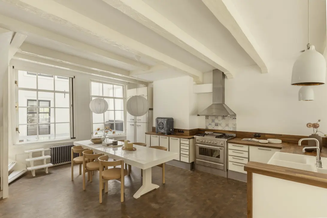 De woonkeuken is gesitueerd op een halve verdieping en voorzien van hoge balkenplafonds, een authentieke gietijzeren kachel en een houten vloer. De keuken is uitgevoerd in hoekopstelling met een houten werkblad, dubbele spoelbak met een mengkraan en een separate Quooker, een Smeg fornuis en een brede oven. De betegelde schouw en wandafwerking in klassiek wit en blauw getint tegelwerk sluiten aan op het oorspronkelijke karakter van de woning. Ramen aan de achterzijde bieden toegang tot een beschutte patio.