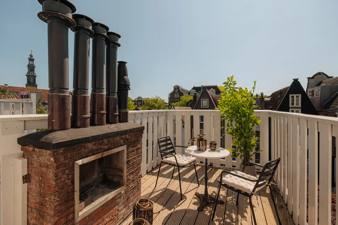 Connected to the living room is the roof terrace of approximately 7 m², offering stunning views over the neighborhood and the iconic Westertoren. From early morning until late afternoon, this is a wonderful spot to enjoy the sunshine.