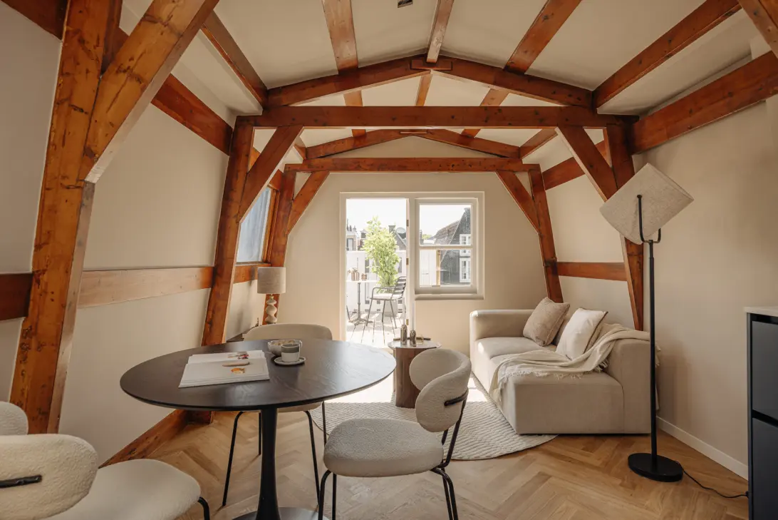 Upon entering, you step into the atmospheric living room with exposed wooden beams — a feature that immediately gives the space character. The abundance of natural light is striking.