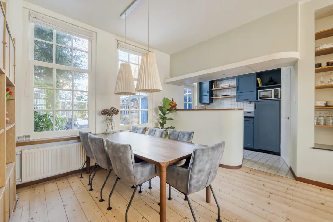Grote ramen aan de voor- en achterzijde zorgen voor veel lichtinval in de woon-/eetkamer, met een houten vloer en een subtiel hoogteverschil. Aan de voorzijde is het zitgedeelte, met een houtkachel en schilderachtig uitzicht naar het water. Het eetgedeelte, met een 3 meter hoog plafond en mooi uitzicht naar de tuin, grenst aan de keuken.