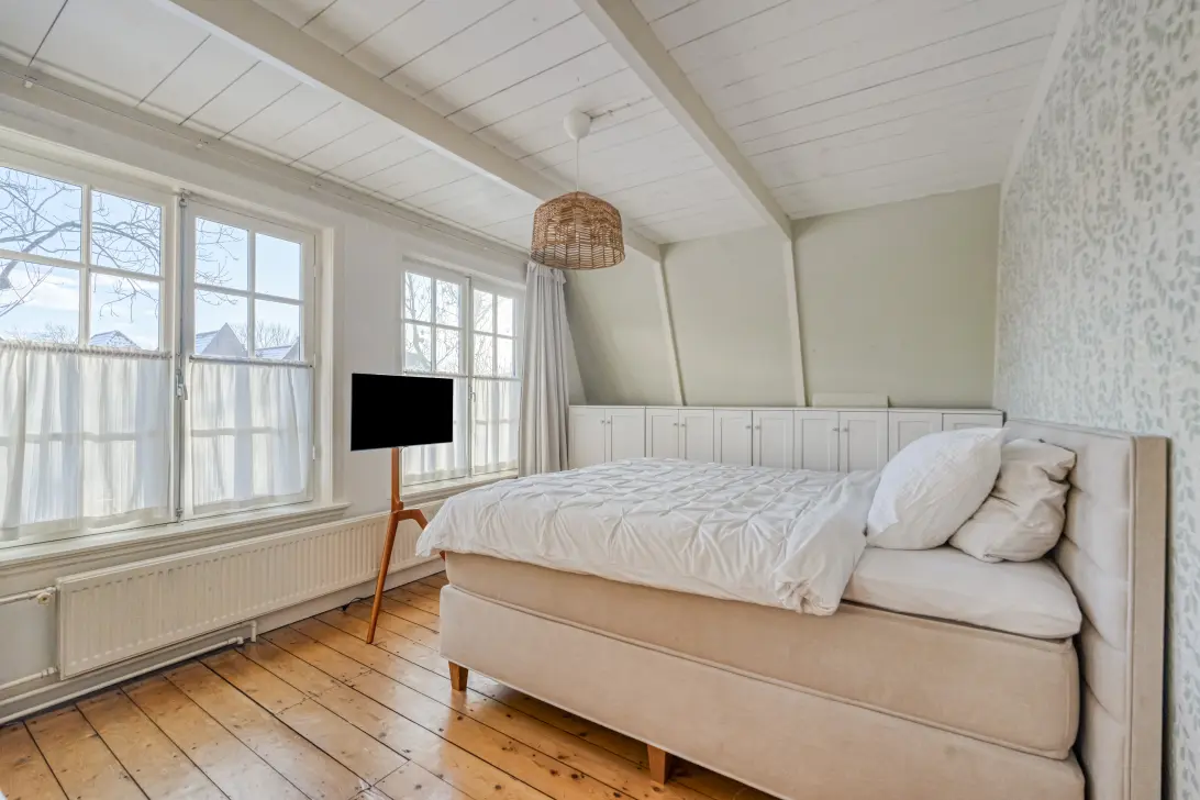 Vanaf de overloop is er toegang tot drie sfeervolle slaapkamers en de badkamer. Aan de achterzijde zijn twee superleuke kinderkamers en aan de voorzijde is de royale master bedroom. Fraaie elementen zijn de houten vloeren en plafonds, de vaste kasten en de ramen met ruitverdeling.