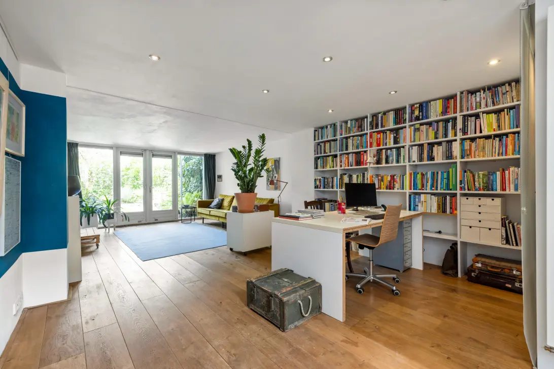 Het souterrain vormt een extra verrassing: een stijlvolle verdieping met eikenhouten vloer die volop mogelijkheden biedt. Hier vind je een ruime tv-/woonkamer of speelruimte – ideaal voor gezellige filmavonden of als plek waar kinderen ongestoord kunnen spelen. Daarnaast is er een tweede toilet en heb je directe toegang tot de prachtig aangelegde tuin. Momenteel is deze ruimte ingericht als woon-/werkkamer, maar de indeling leent zich uitstekend voor uiteenlopende woonwensen.