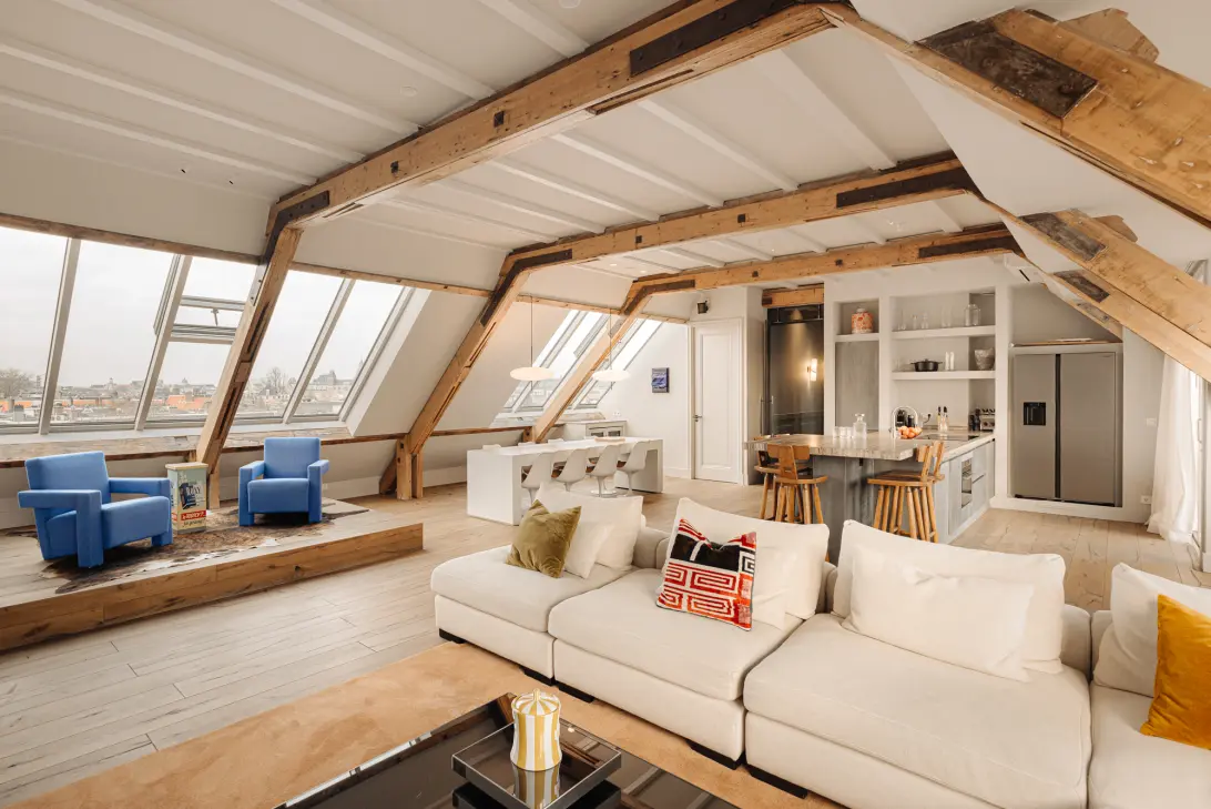 Aan de achterzijde opent de woning zich naar een royale leefkeuken, voorzien van lichtstraten en openslaande deuren naar de daktuin. De keuken is recent vernieuwd en uitgerust met een combi-oven/magnetron, vaatwasser, Amerikaanse koelkast en een stijlvol kookeiland met een recirculerende Bora inductiekookplaat. Tegels met vloerverwarming maken het comfort compleet.