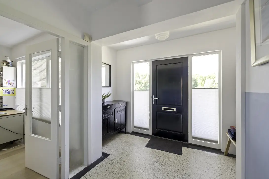 Via openslaande deuren staat de woonkamer in directe verbinding met het royale terras aan de achterzijde. De gehele woonlaag is afgewerkt met eikenhouten parket en terrazzovloeren, beide voorzien van vloerverwarming. Aan de voorzijde bevindt zich de voormalige directiekamer, nu in gebruik als kantoor met doorloop naar een bergruimte (voorheen de bankkeuken).