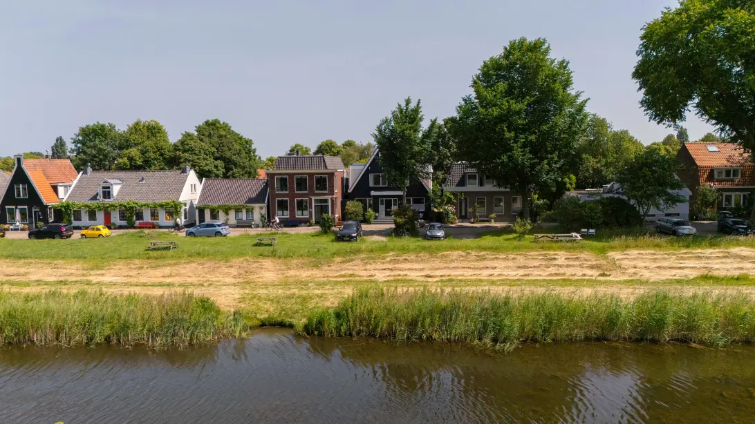 Wat direct opvalt, is de iets terug liggende ligging ten opzichte van de dijk. Hierdoor ontstaat niet alleen extra ruimte en privacy, maar ook een prachtig, vrij uitzicht over het rietland aan de voorzijde van de woning. De trap aan de voorzijde van de woning is gemaakt van Belgisch hardsteen en deze is onderheid evenals de aanbouw. Op dijkniveau bevinden zich onder meer een entree met granitovloer en garderobemogelijkheid, een royale doorzon woonkamer, een ruime eetkamer en een moderne leefkeuken voorzien van de benodigde inbouwapparatuur (deels ter overname) met aangrenzend de originele kluis uit de bankperiode – een uniek detail dat het karakter van het huis onderstreept. De woonkamer staat via openslaande deuren in verbinding met een royaal en breed terras, gelegen over de volledige achtergevel. De gehele woonlaag is voorzien van eikenhouten parket en een terrazzovloer, beiden met comfortabele vloerverwarming. Aan de voorzijde is de oude directie kamer, nu in gebruik als kantoor met een doorloop naar de voormalige keuken van de bank, nu een berghok.