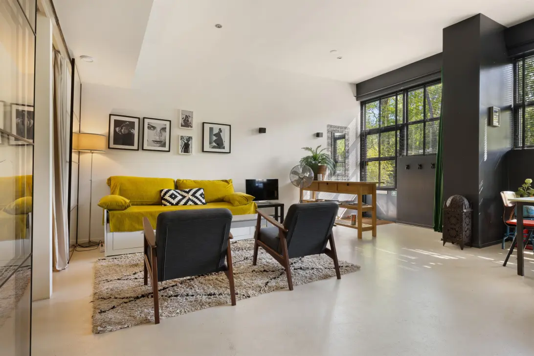 De trap komt uit op de eerste etage met de riante woonkamer (ca. 4,35 meter hoog). De stoere donkere kozijnen, de prachtige hoge ramen met uitzicht op het Vliegenbos, de stalen balken en houten plafonds maken dit tot een zeer bijzondere ruimte met een industrieel karakter.