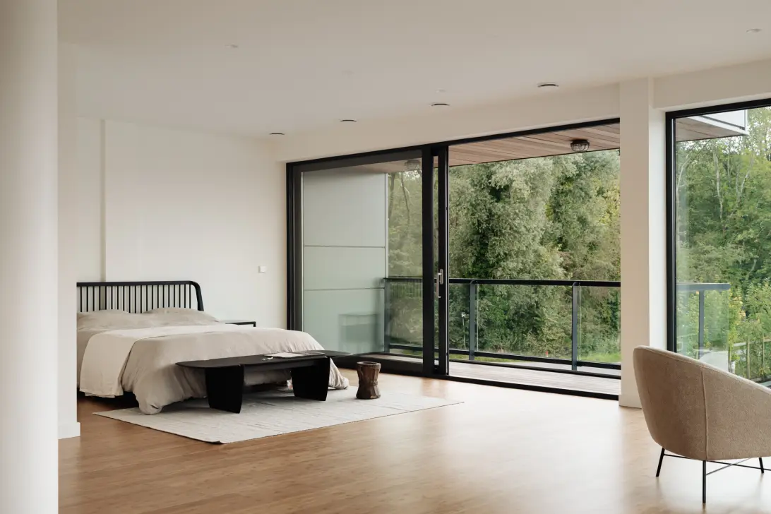 The top floor boasts large windows on both the waterside and the right side. The L-shaped space is perfect for a spacious seating area at the rear and an open kitchen with a cooking island adjacent to the balcony. This generous balcony offers stunning views of the characteristic harbor and the surrounding greenery.
