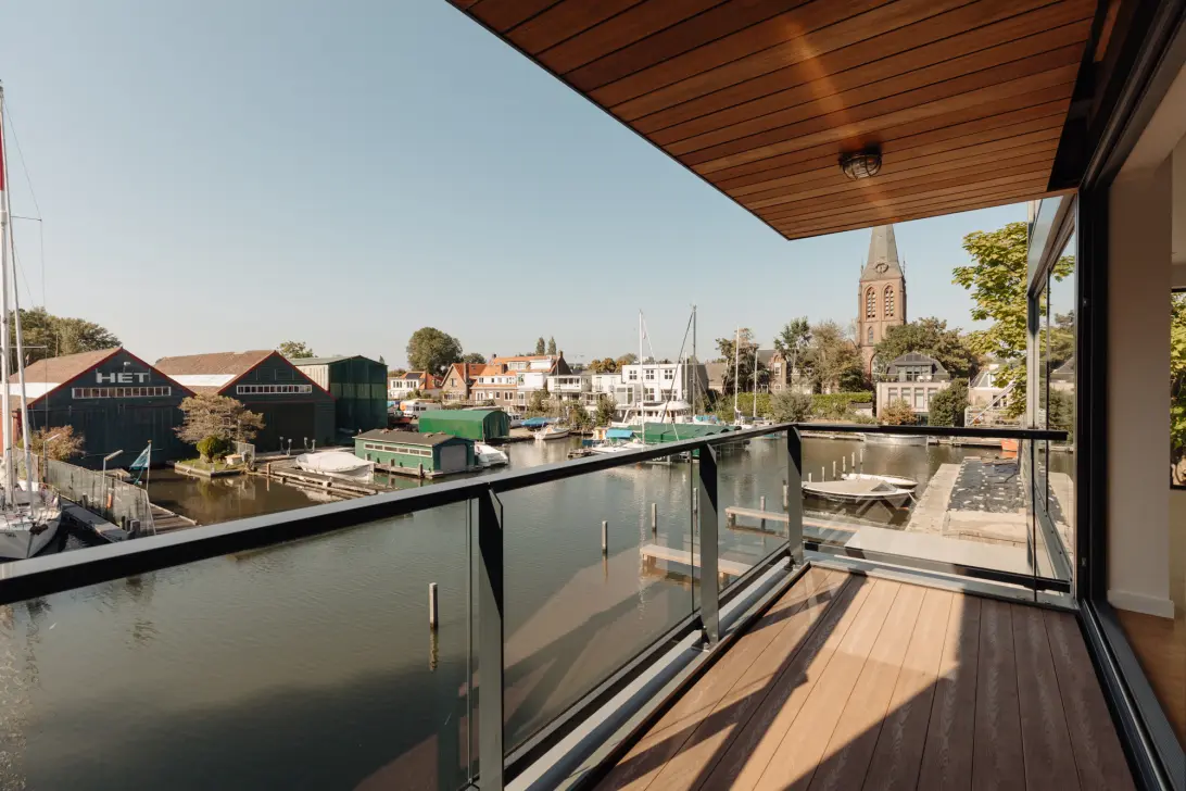 De bovenste verdieping heeft grote raampartijen aan zowel de waterzijde als de rechterzijde. De L-vormige ruimte leent zich perfect voor een ruime zithoek aan de achterzijde en een open keuken met kookeiland, grenzend aan het balkon. Dit ruime balkon biedt een prachtig uitzicht over de karakteristieke haven en het omliggende groen.
