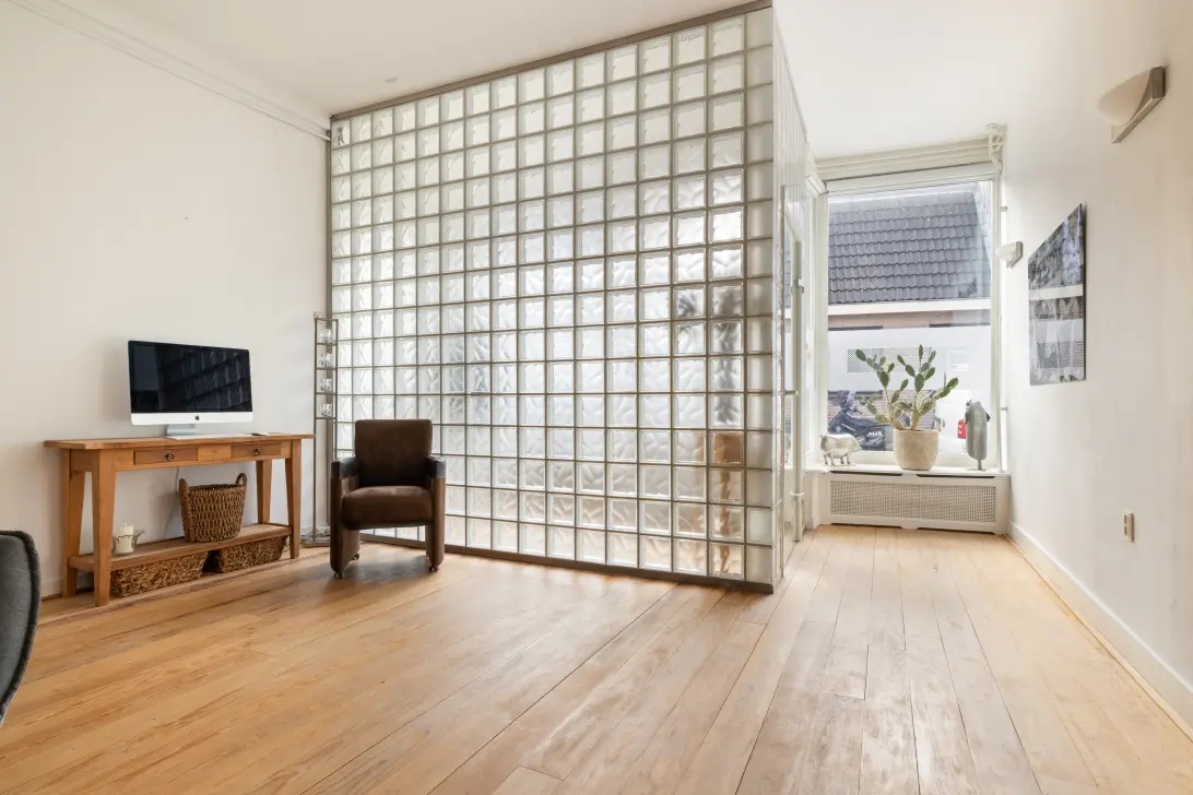 Bij binnenkomst een ruime hal met garderobe. Achter de glazen bakstenen schuilt een royale woonkamer die indruk maakt door de lengte, het licht en de open indeling. De spiltrap staat centraal maar breekt de ruimte niet op waardoor de woonkamer nog groter aanvoelt.