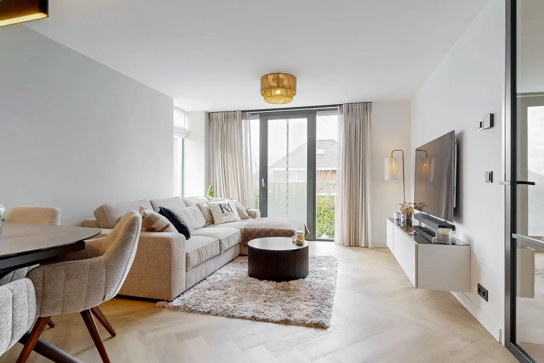 De heerlijk lichte woonkamer is een plaatje om te zien dankzij de kamerhoge ramen, strakke wanden en plafonds. Plaats een gezellige zithoek en plof na een lange dag gerust neer; hier kun je jezelf even opladen.