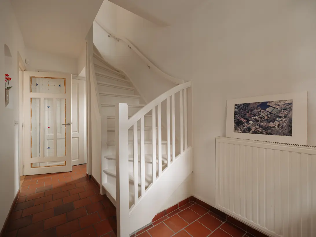 Via de entree met garderobe bereikt u aan de rechterzijde de trap naar boven. Rechtdoor bevindt zich het toilet, slim afgesloten met een schuifdeur, én de trap naar beneden.