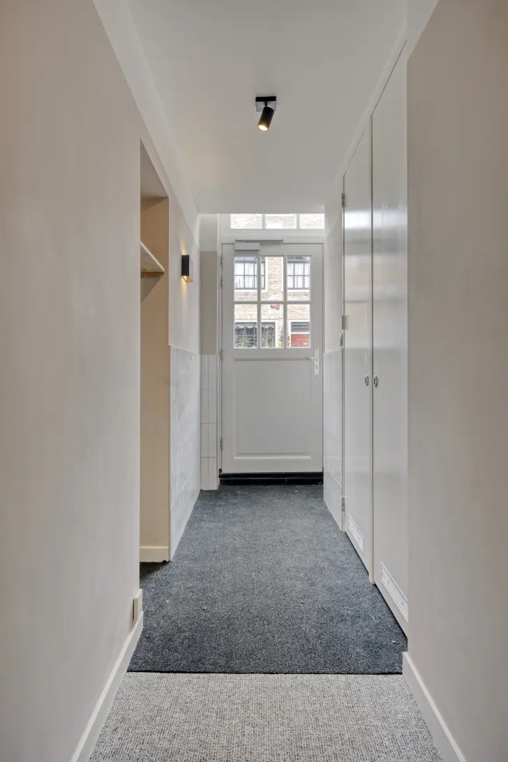Aan de linkerzijde is de voordeur van 40a, die aan de voorzijde van het pand gesitueerd is. Bij binnenkomst sta je in een ruime hal met de meterkast en een hoek, die als werk-/studeerplek gebruikt kan worden. De muren en het plafond zijn gestuct, inbouwverlichting is geplaatst en de deuren zijn voorzien van trendy deurbeslag. De stijlvolle zwarte deur met glas zorgt, via de woonkamer, voor lichtinval.