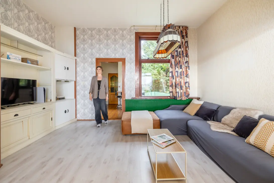 Je stapt binnen in de hal. Vanuit hier loop je door naar de woonkamer. Een fijne, lichte ruimte met grote raampartijen en dat uitzicht! De afwerking is eenvoudig: laminaat op de vloer, behang op de wanden en gipsplaten plafonds. Zie het als een basis. Een startpunt. Hier geef jij het huis jouw eigen sfeer.